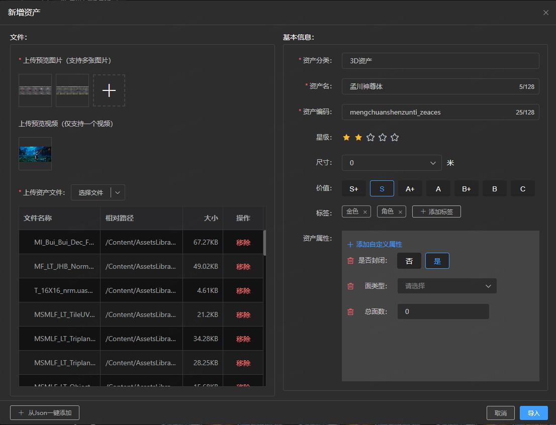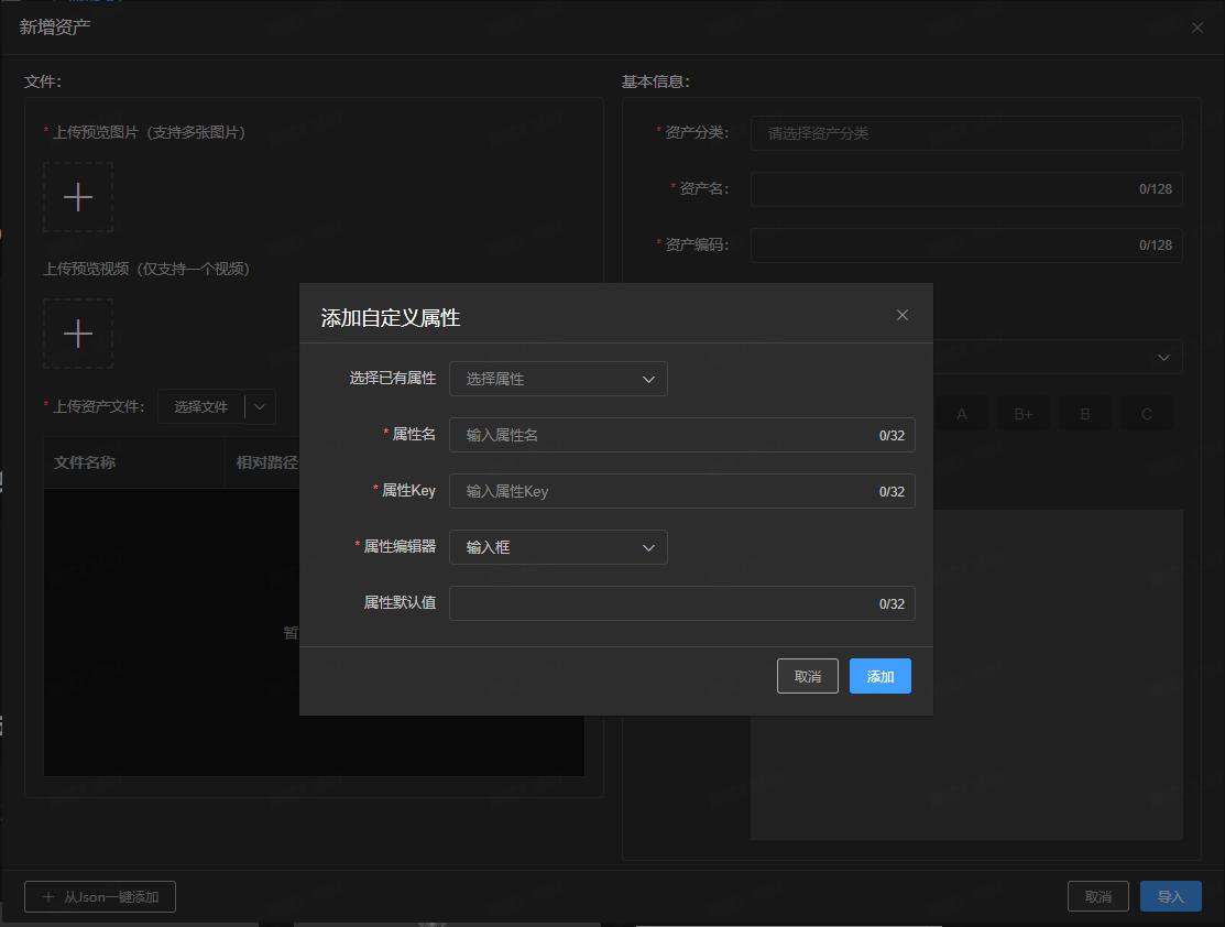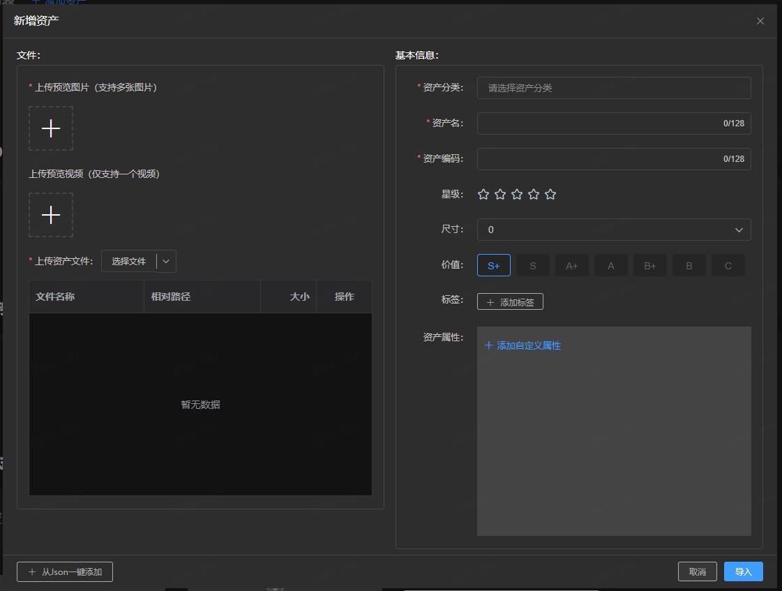在添加资产页面点击左下角从Json一键添加,选择Json文件导入到页面,可在添加资产页调整资产信息,最后点击导入即可添加资产。
