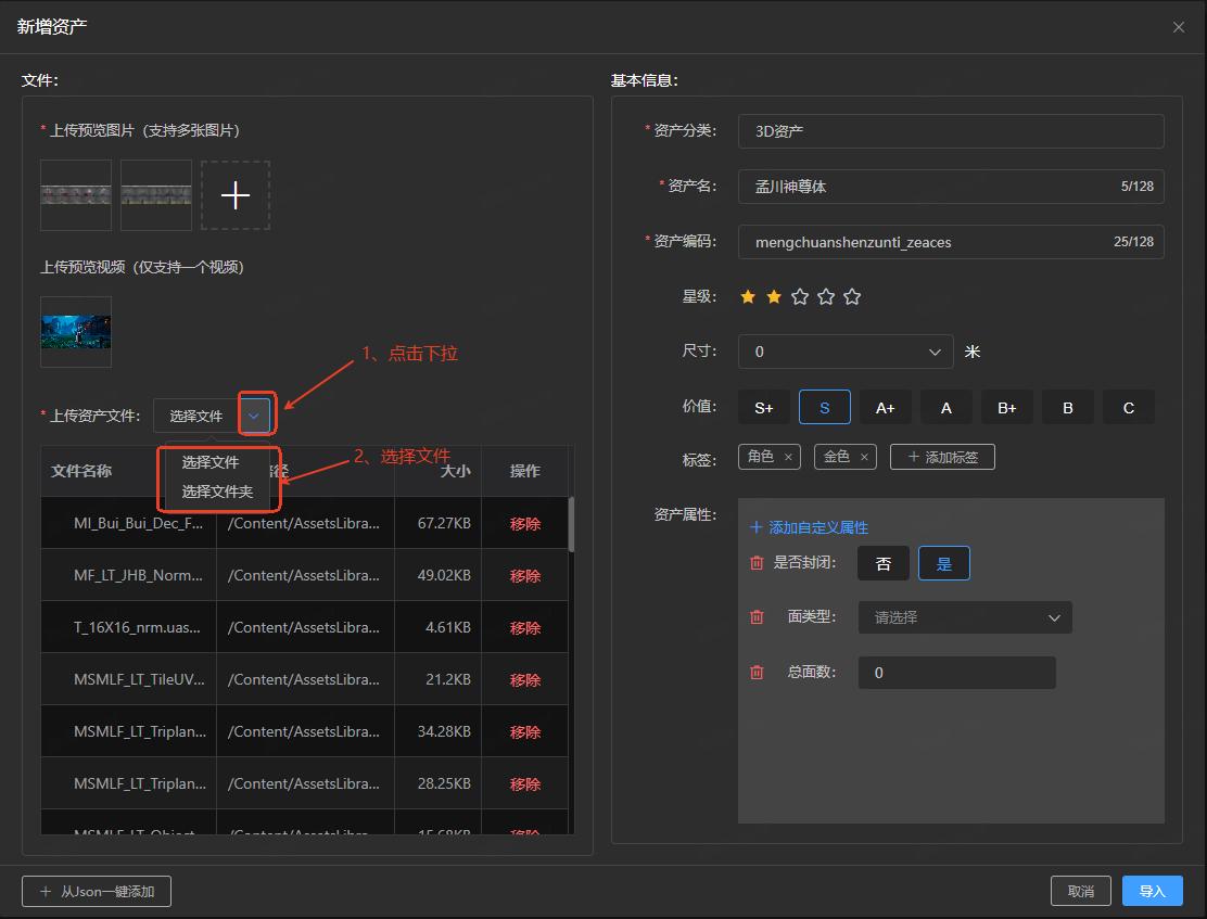 文件除了可以从json文件导入,也可以手动添加文件,在新增资产页面的上传文件一栏中,点击选择文件右方图标,弹出选择文件和选择文件夹两个选项,选择其中一个方式进行文件的选择