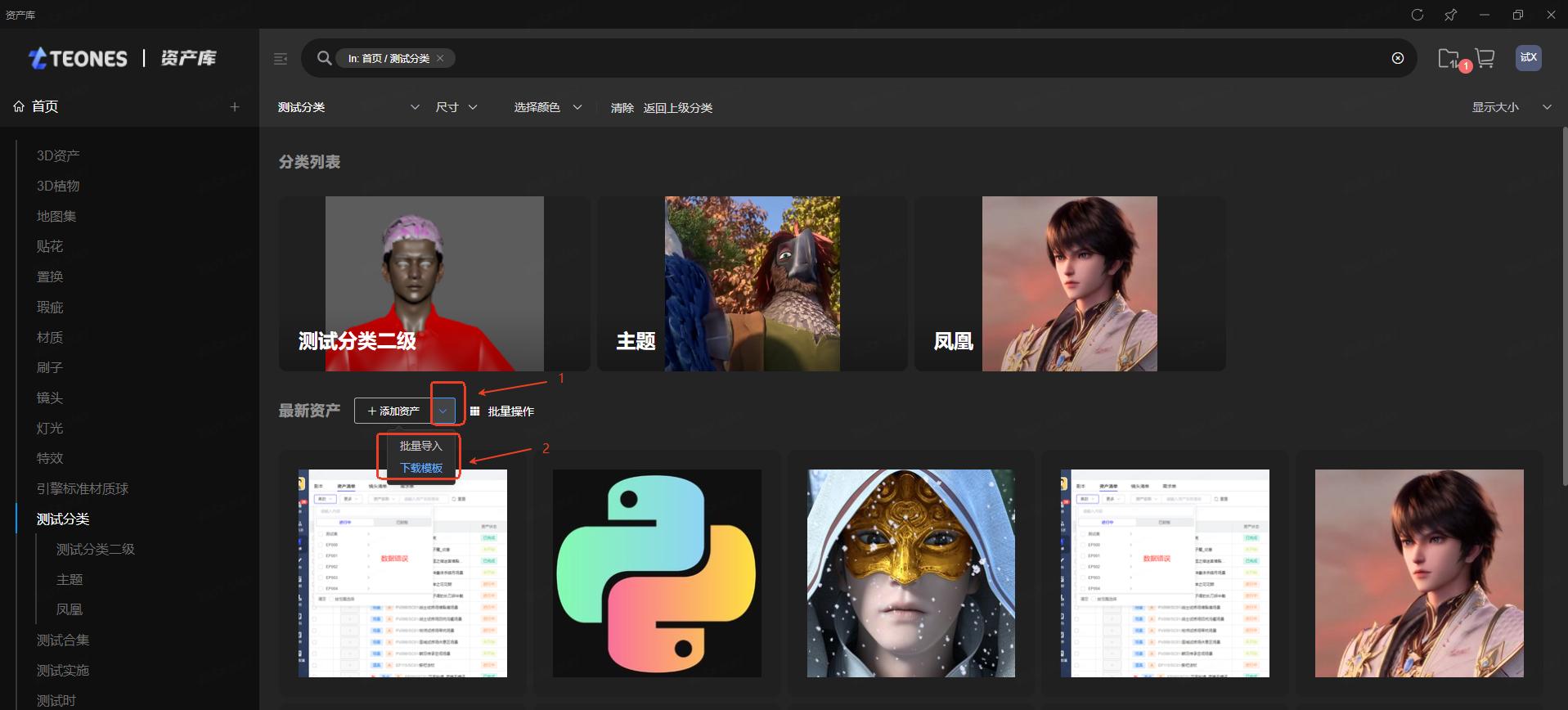 在资产列表上方,点击添加资产按钮右方下拉箭头按钮,弹出下拉选择框,点击下载模板