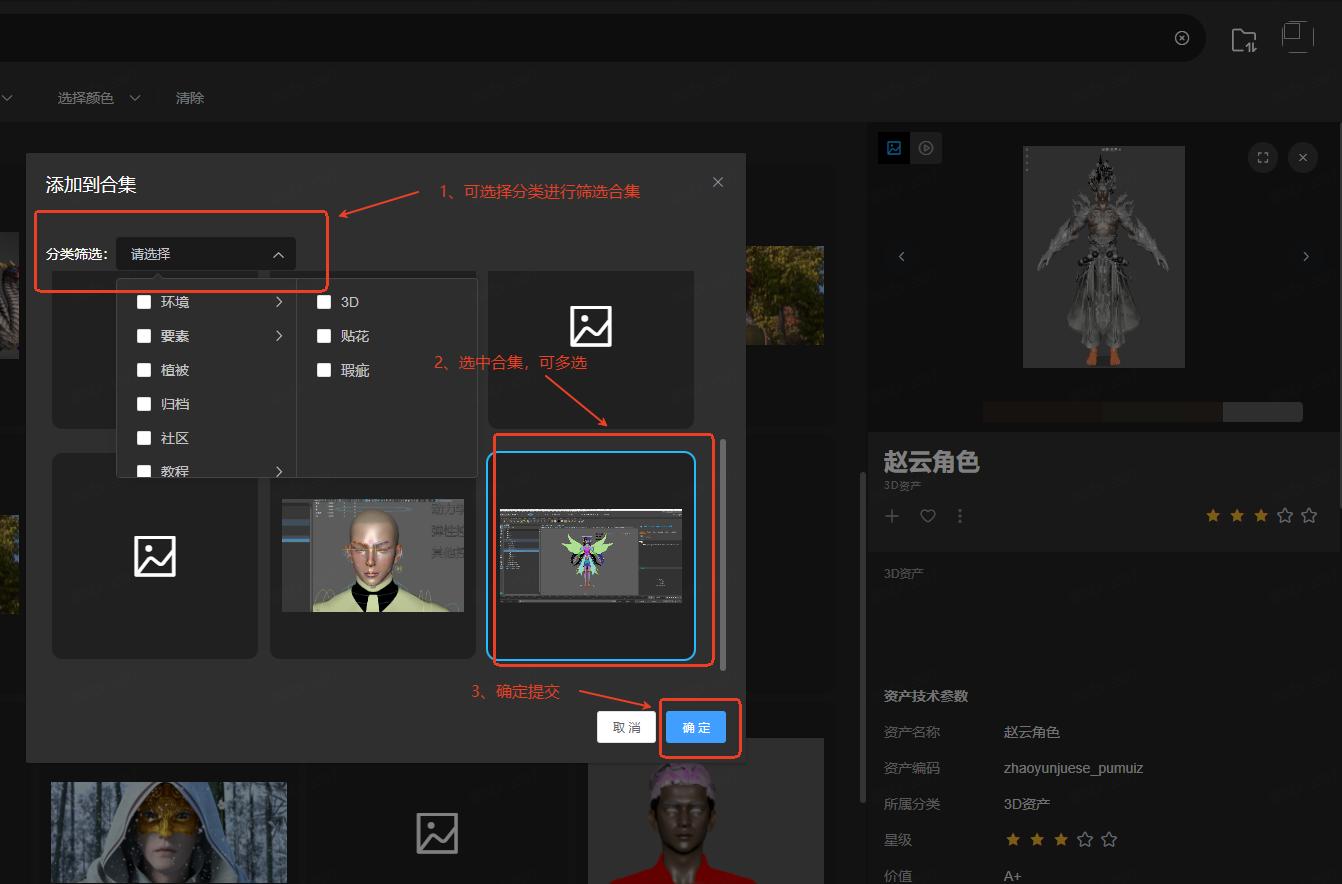 进入合集选择框,可根据分类进行筛选合集,选中合集后(可多选),点击确认即可将资产添加到合集