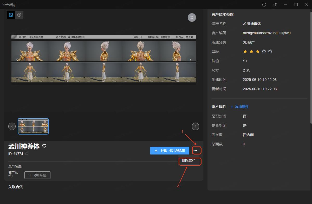 选中需要删除的资产,在右侧的资产信息中,点击资产名称下方