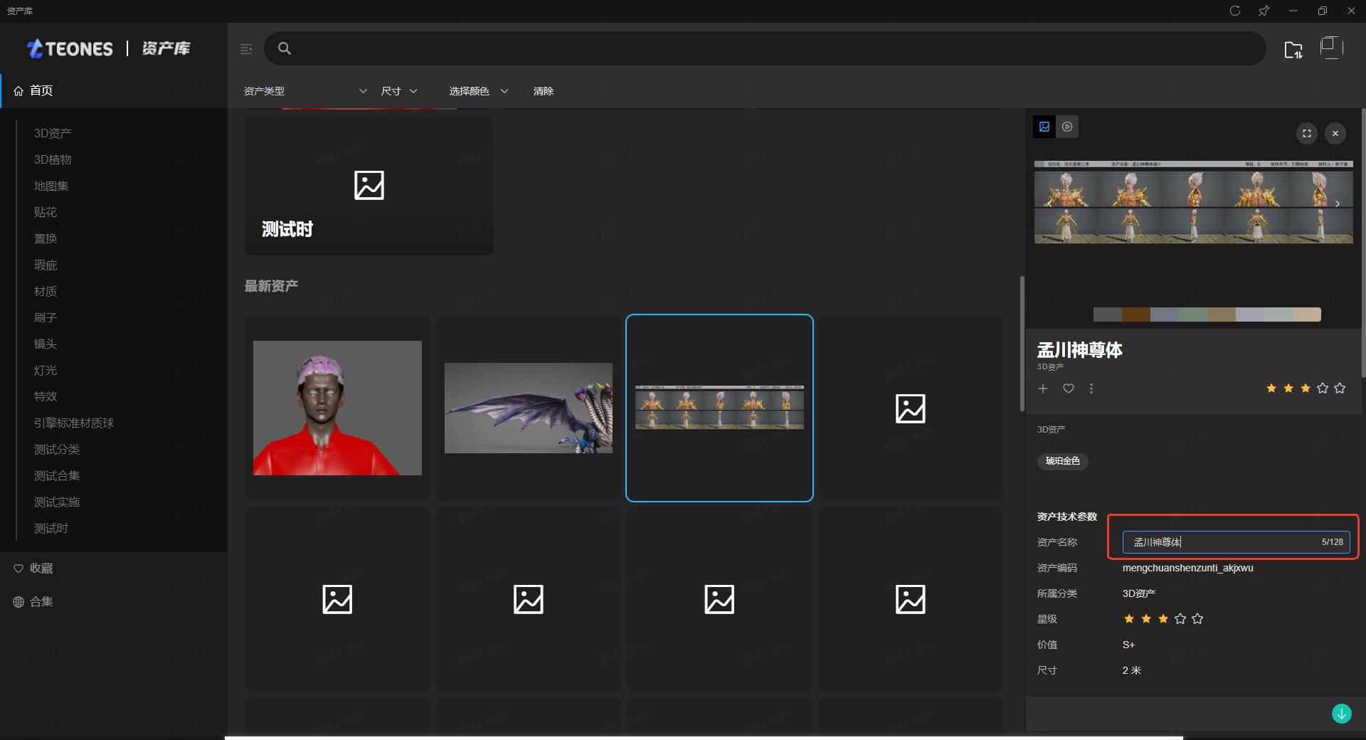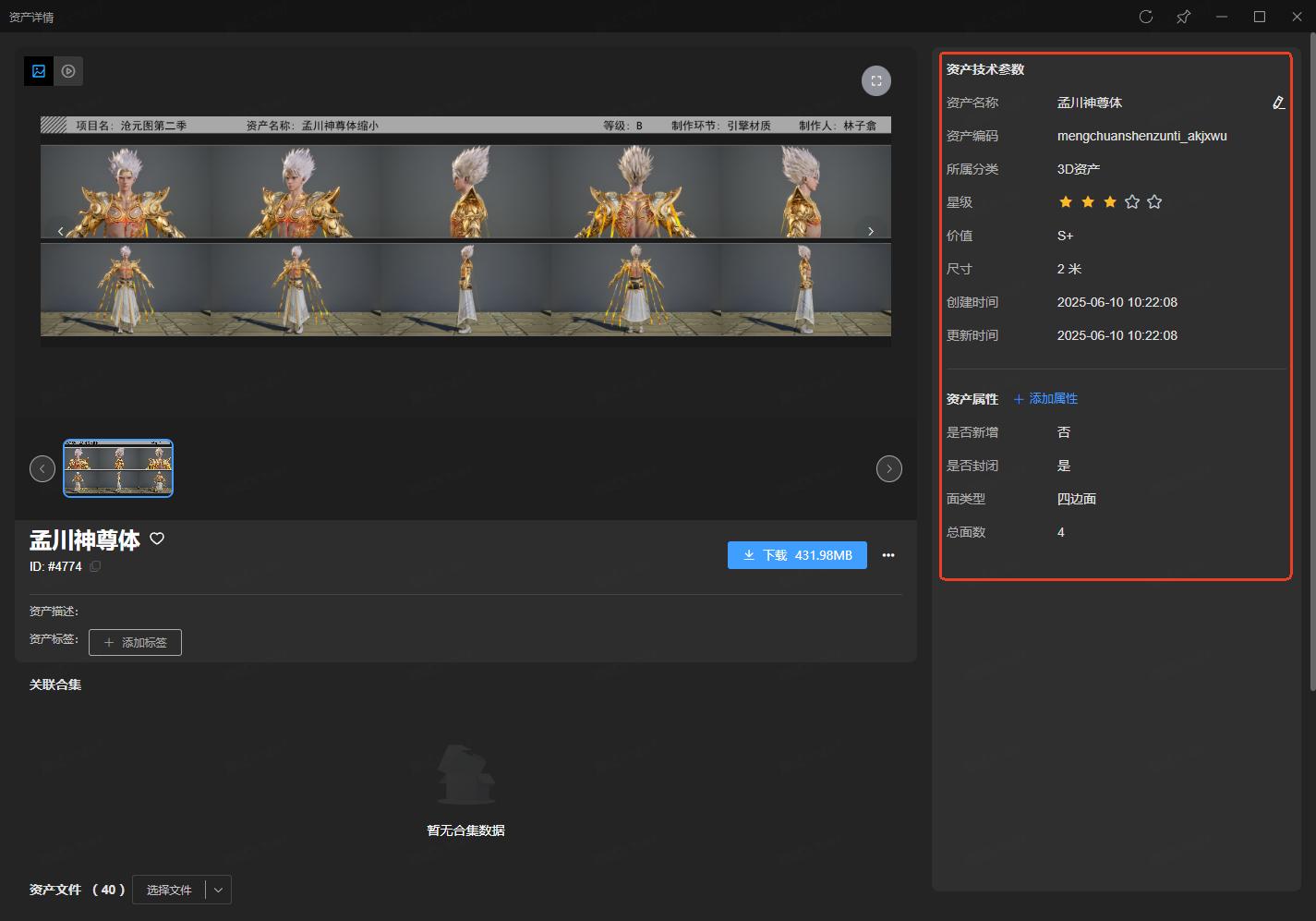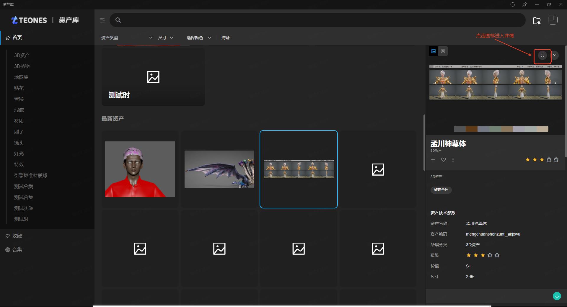 选中资产,列表右侧会展示资产基础信息,点击资产封面图的右上角第一个图标,进入详情页。