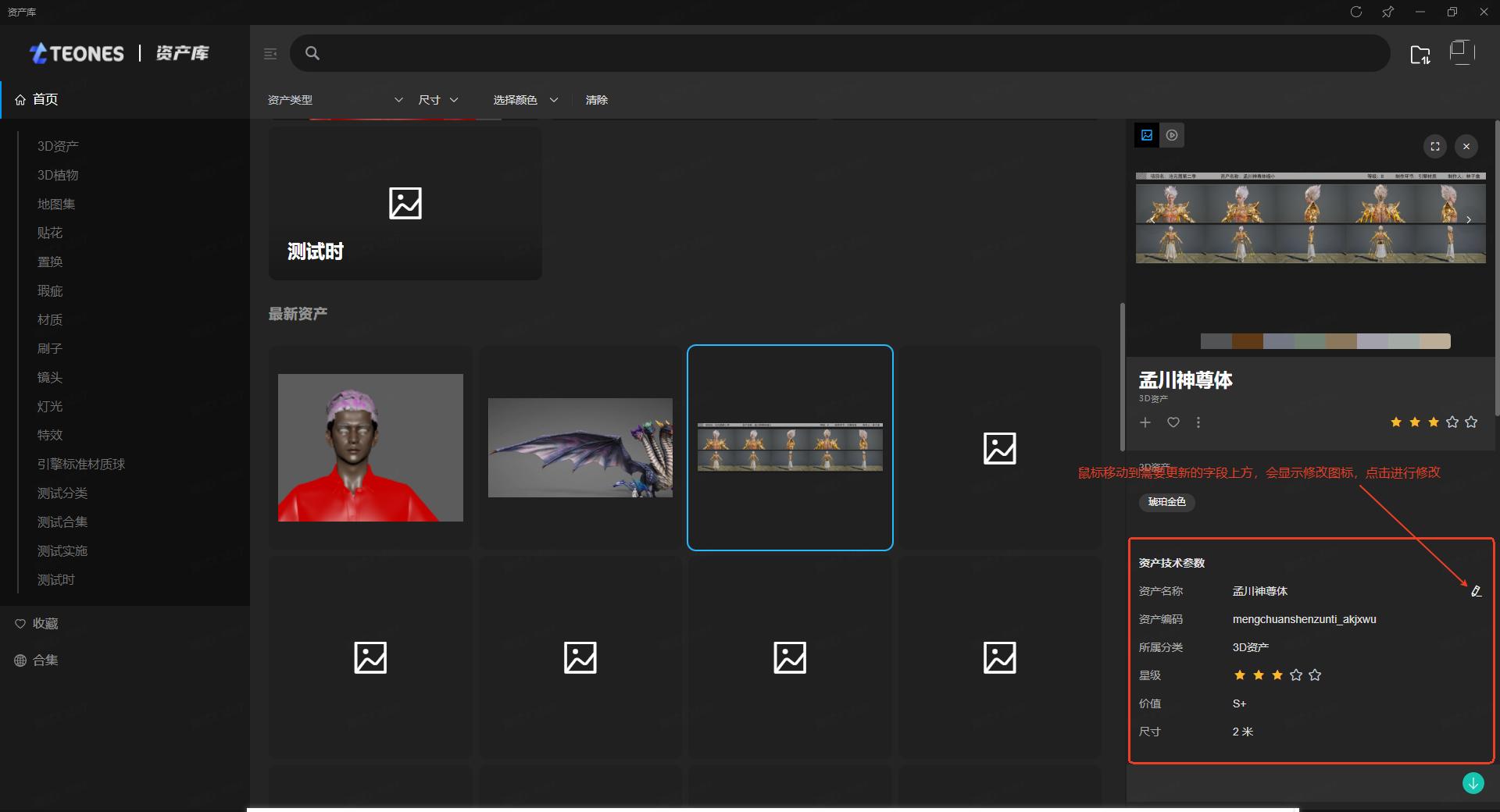 选中资产,列表右侧会展示资产基础信息,将鼠标移动到需要更新的字段上方,会显示修改的图标。