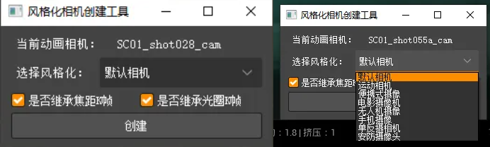 会显示当前正在开启的镜头相机名称。用户可在【选择风格化】下拉框中选择风格化的相机类型,