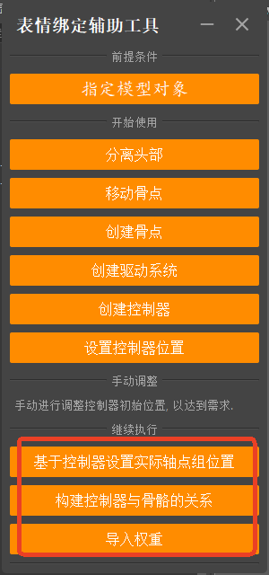 【基于控制器设置实际轴点组位置】、【构建控制器与骨骼的关系】和【导入权重】