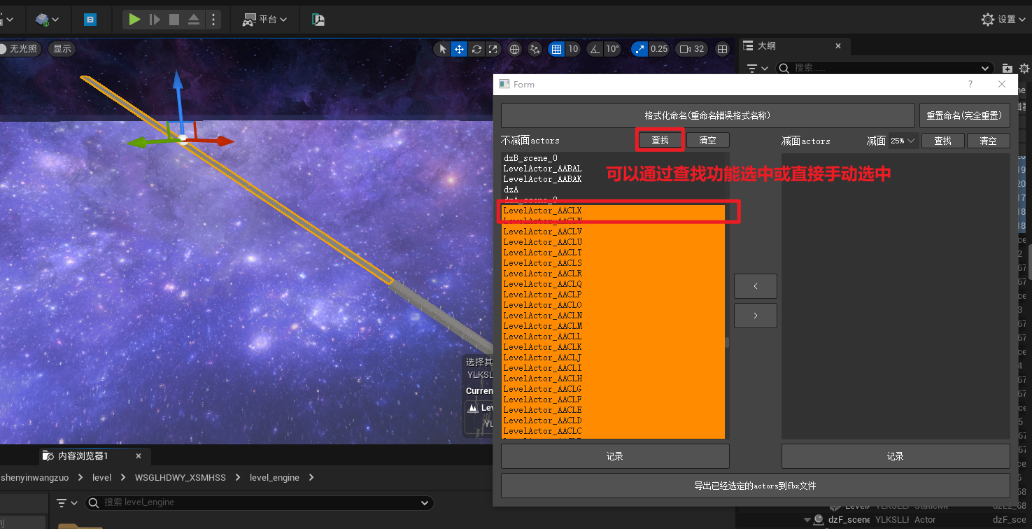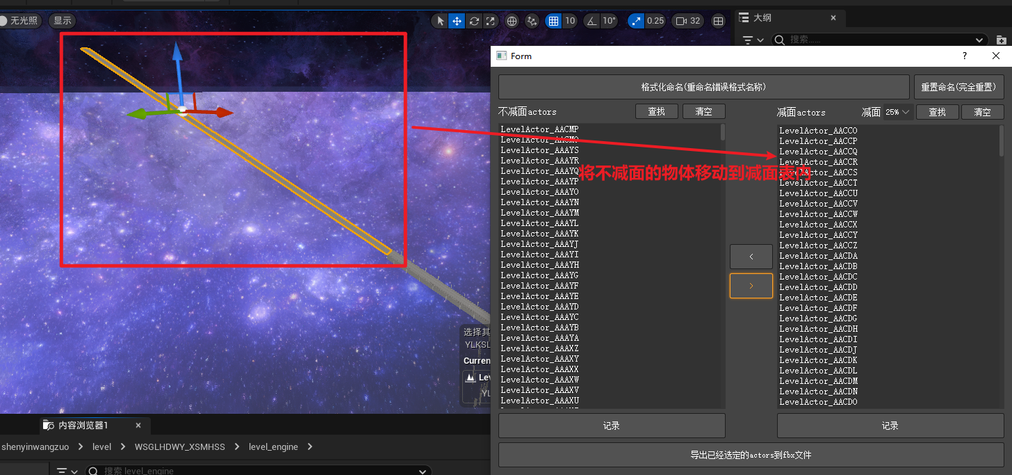 功能详情:将关卡中选中的actor在列表中高亮显示,以便将其切换为减面或不减面的部分。