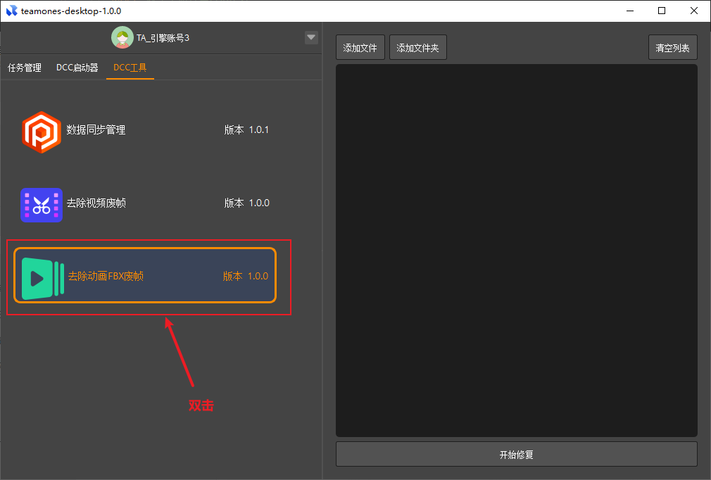 - 双击【去除动画FBX废帧】工具,工具会在右边显示