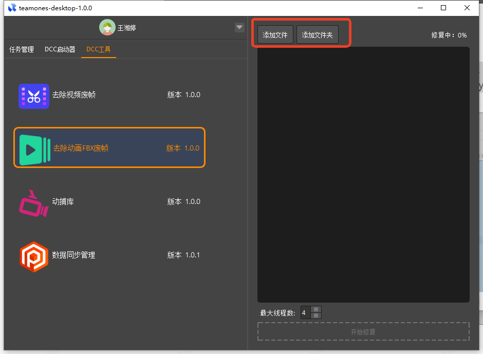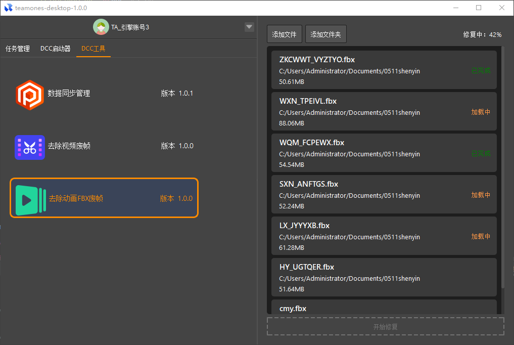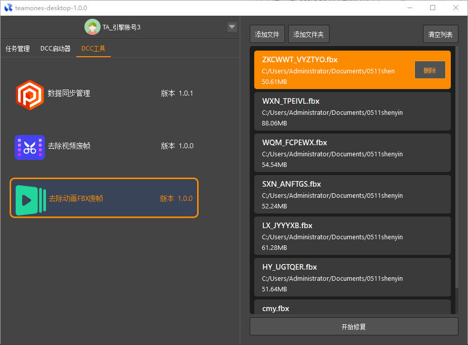 整理完成后,将需要检查或需要修复的fbx文件留在列表内,点击下方的【开始修复】,工具开始进行自动运行。