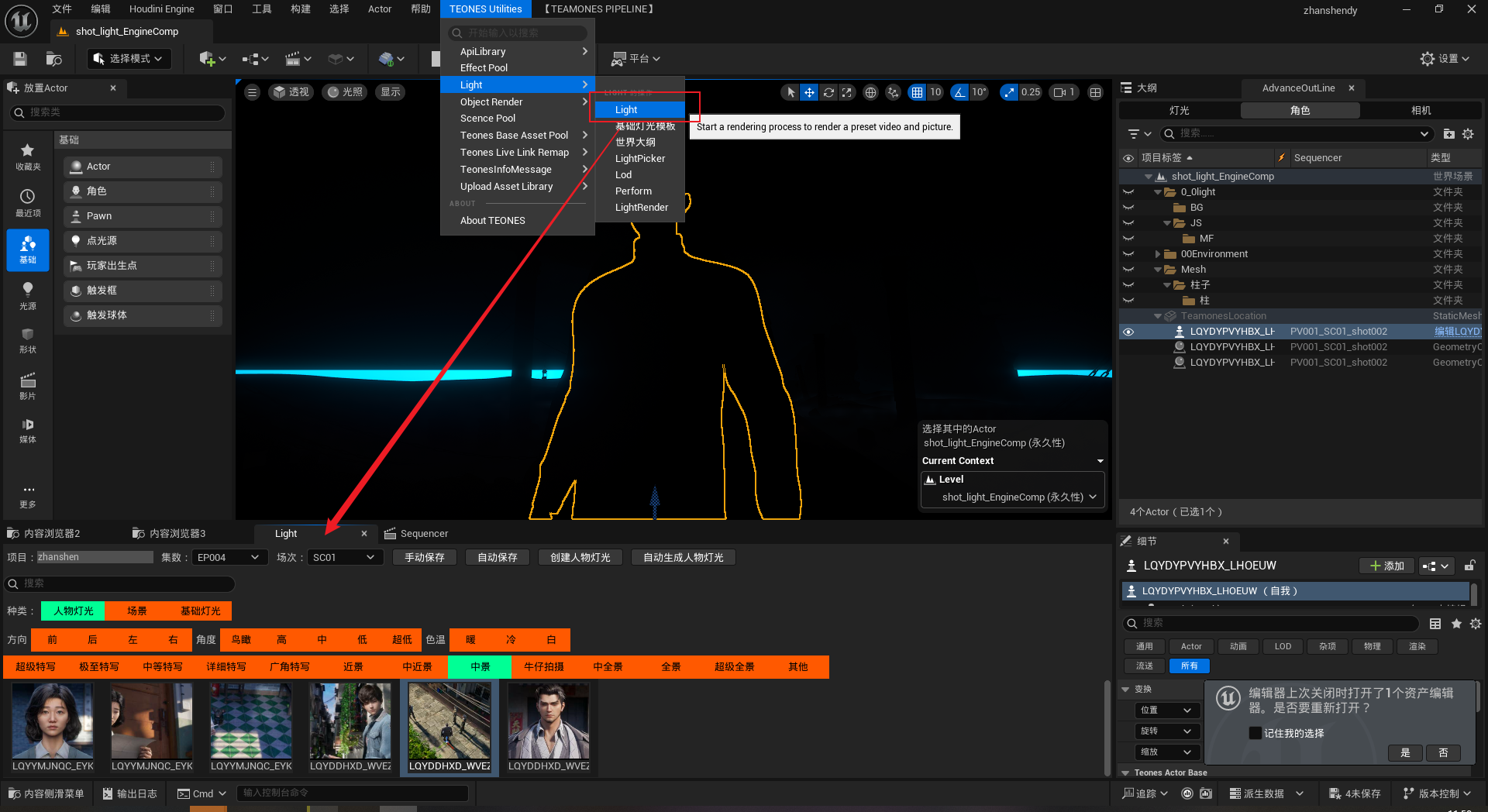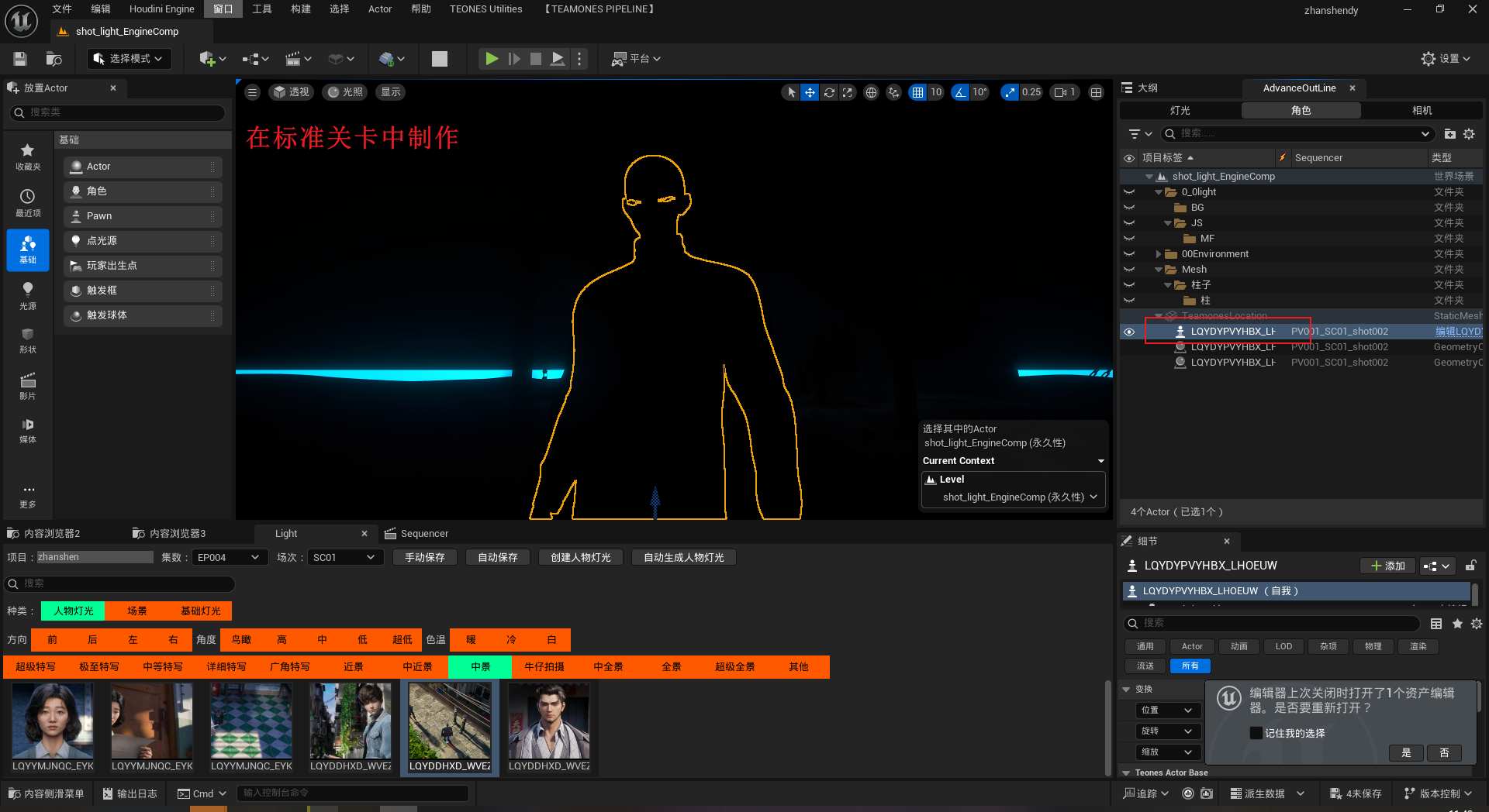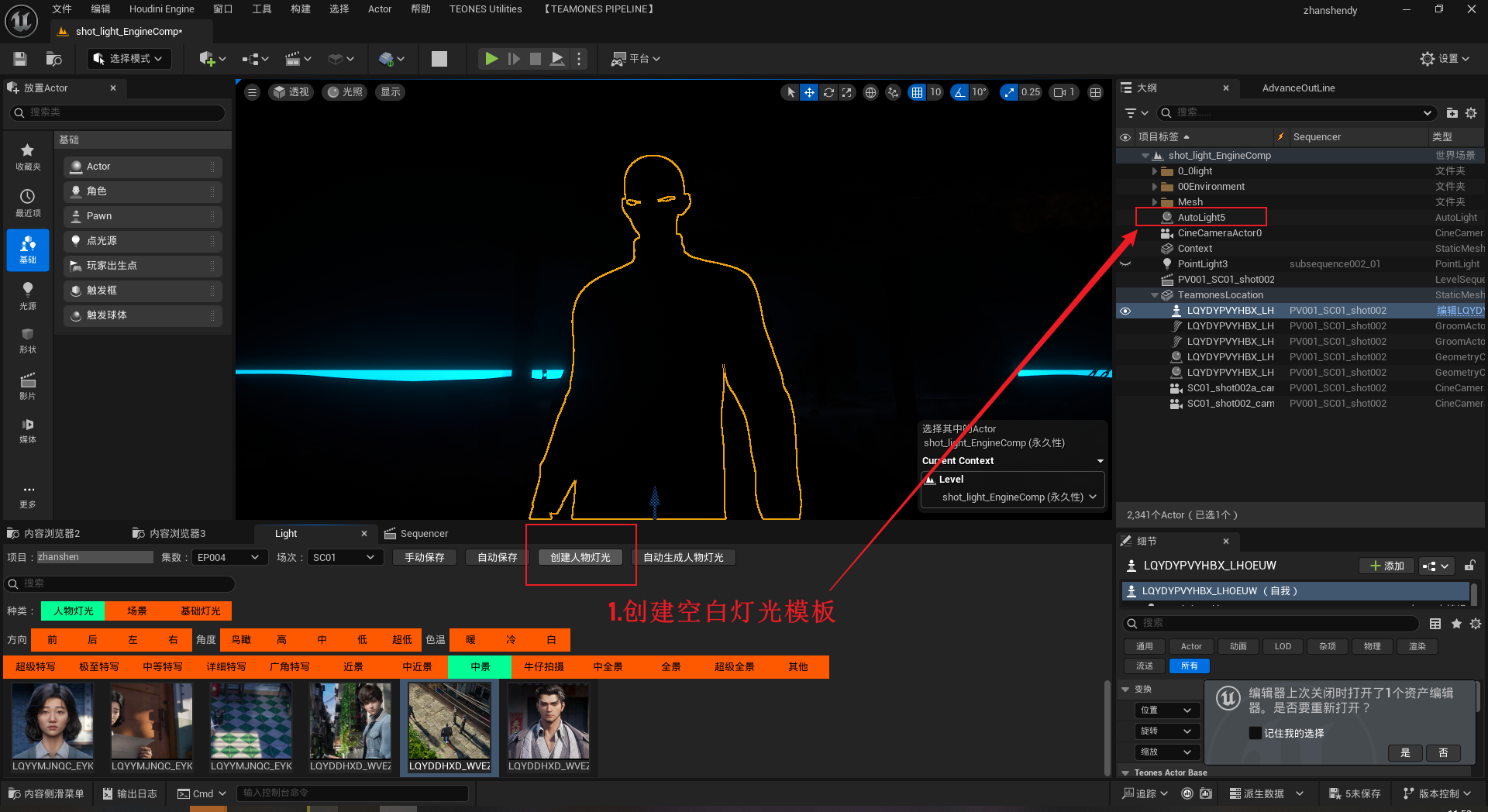 2.1、在大纲目录中选择需要制作灯光模板的人物