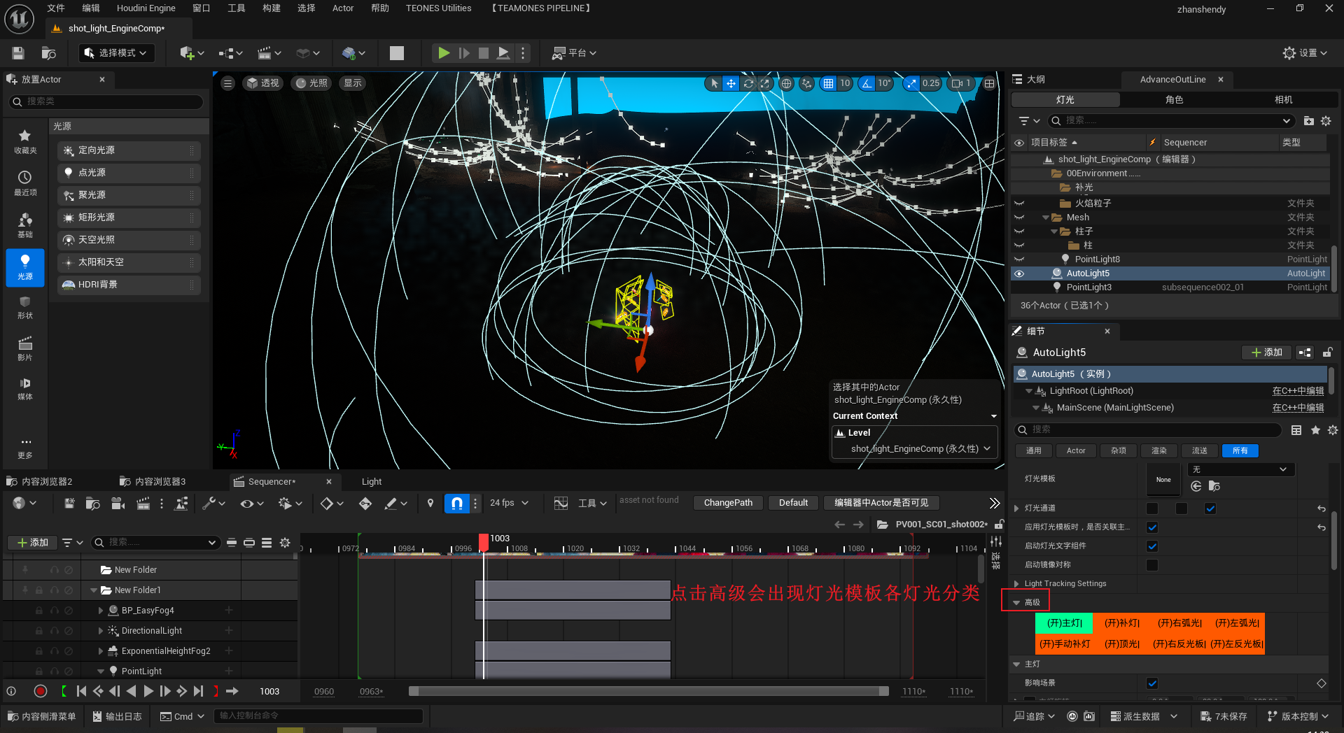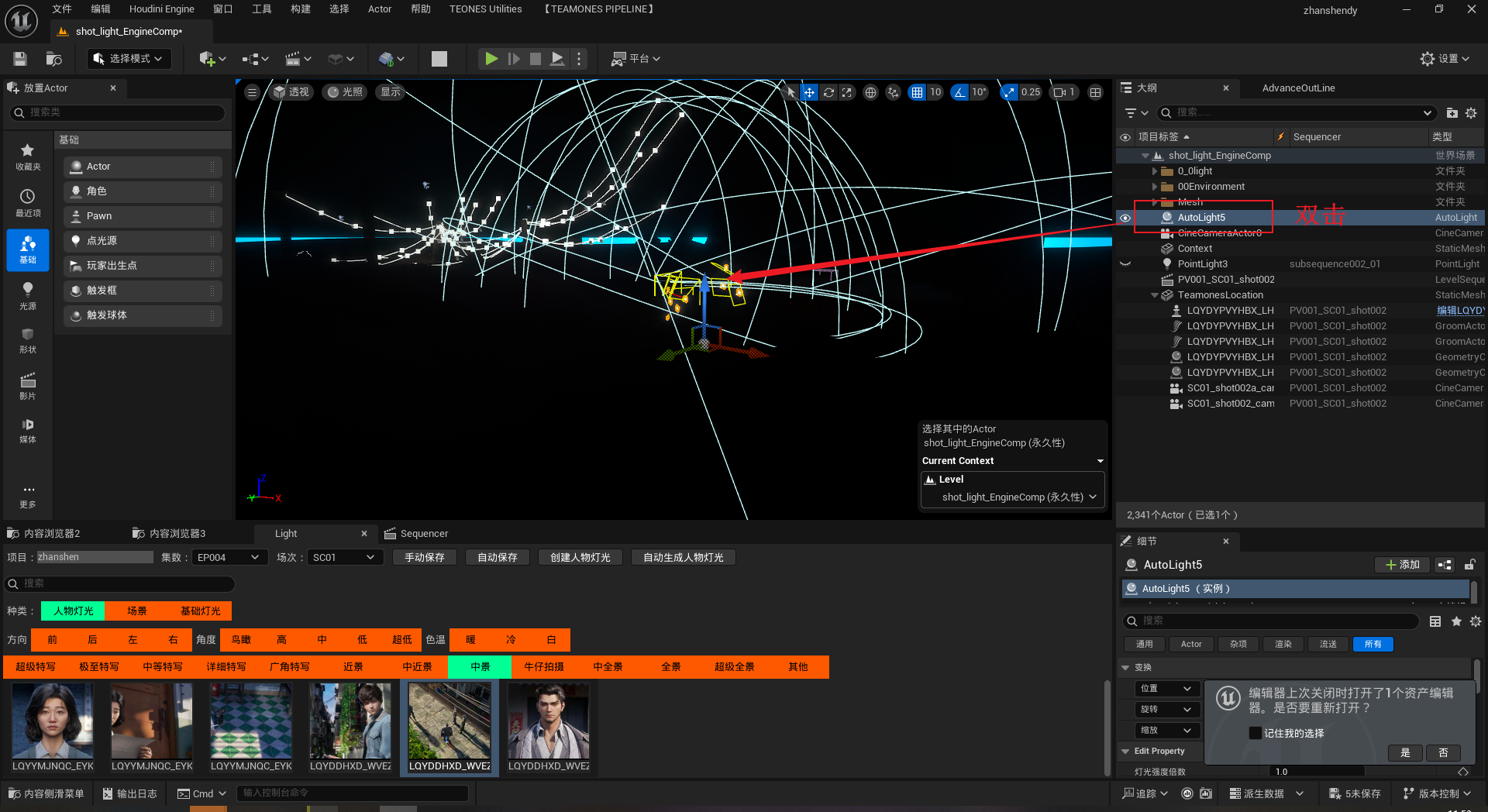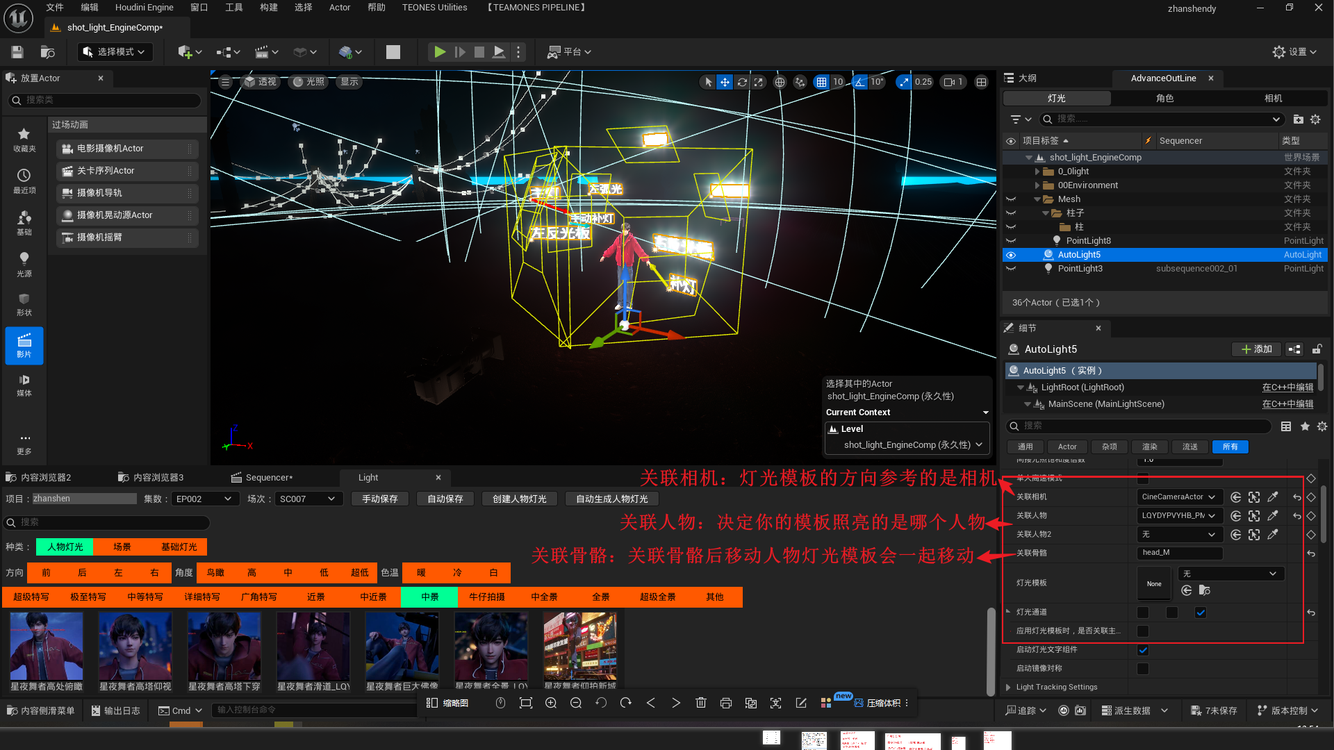 2.1、在大纲目录中选择需要制作灯光模板的人物