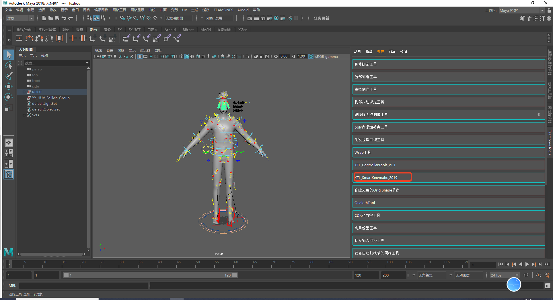 01 打开maya,点击【绑定】,选择【KTL_SmartKinematic_2019】工具。