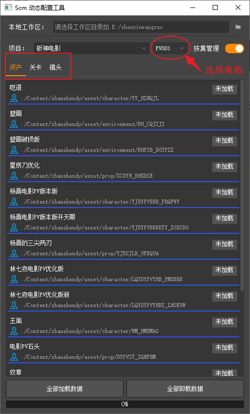可以通过集号检索一整集的镜头或者关联的资产、关卡