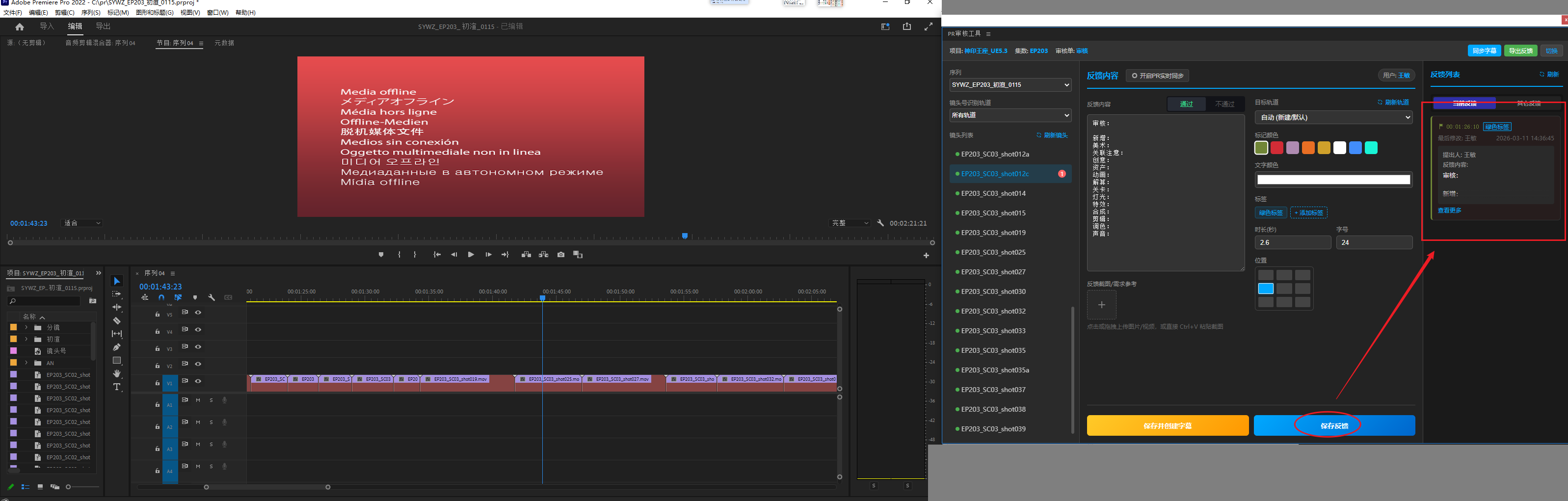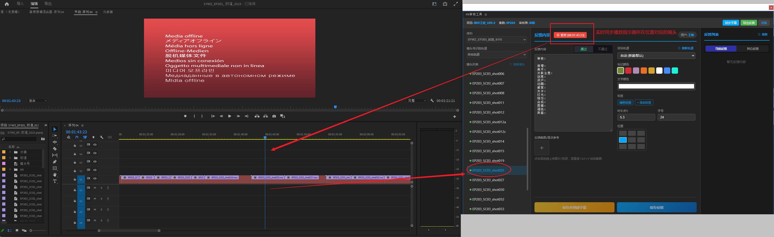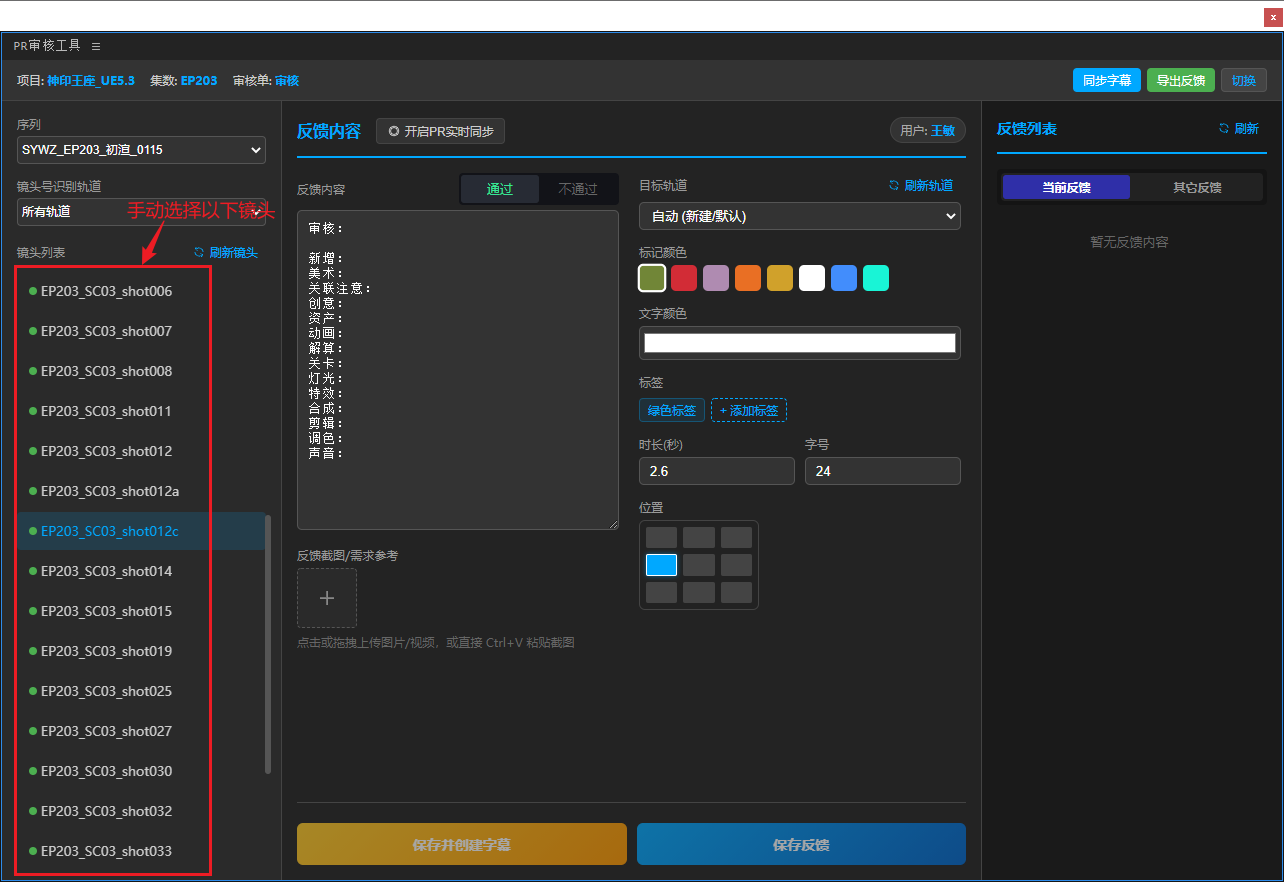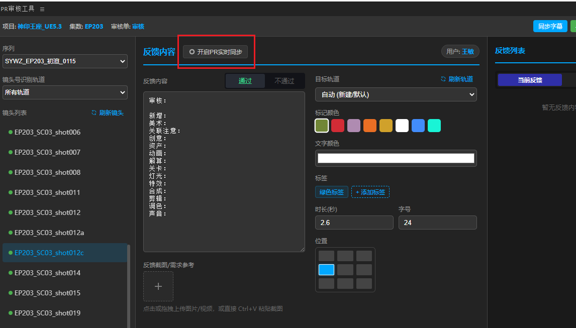 4、在左侧选择要提反馈意见的镜头 或是 “开启PR实时同步”会自动选中当前PR工程播放指示器所在位置对应的镜头