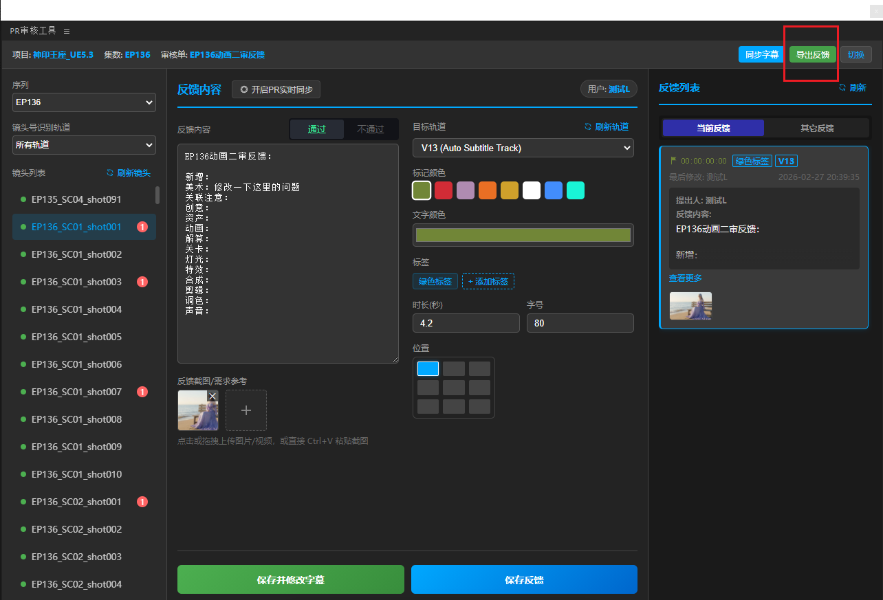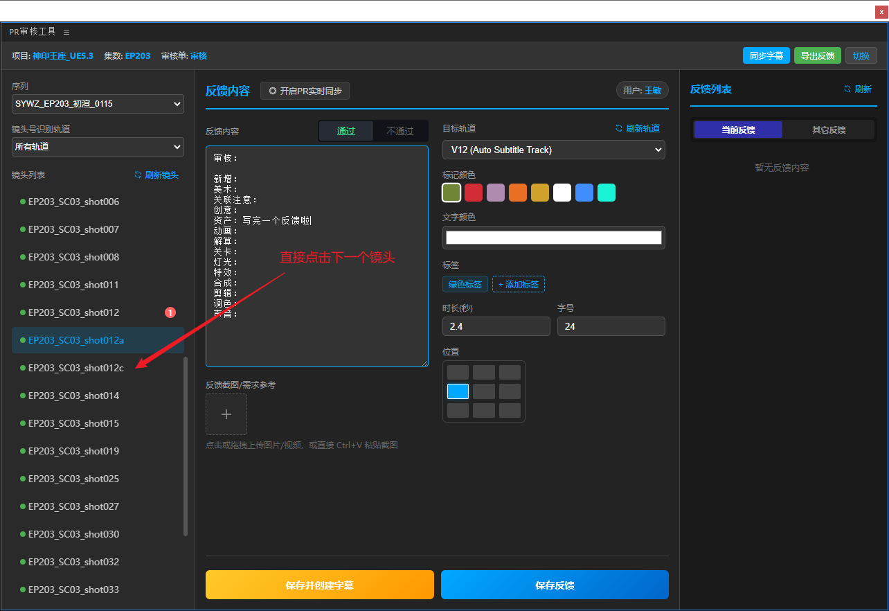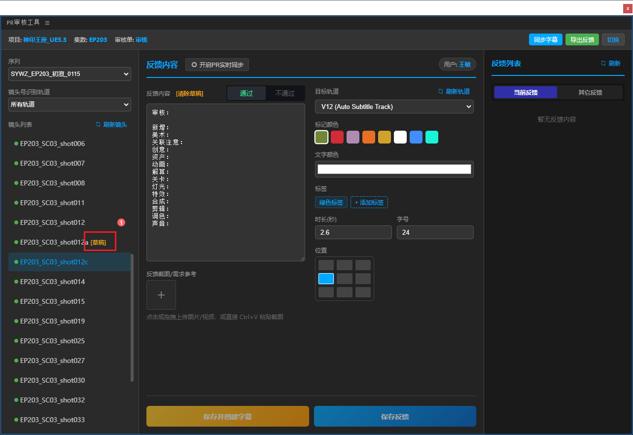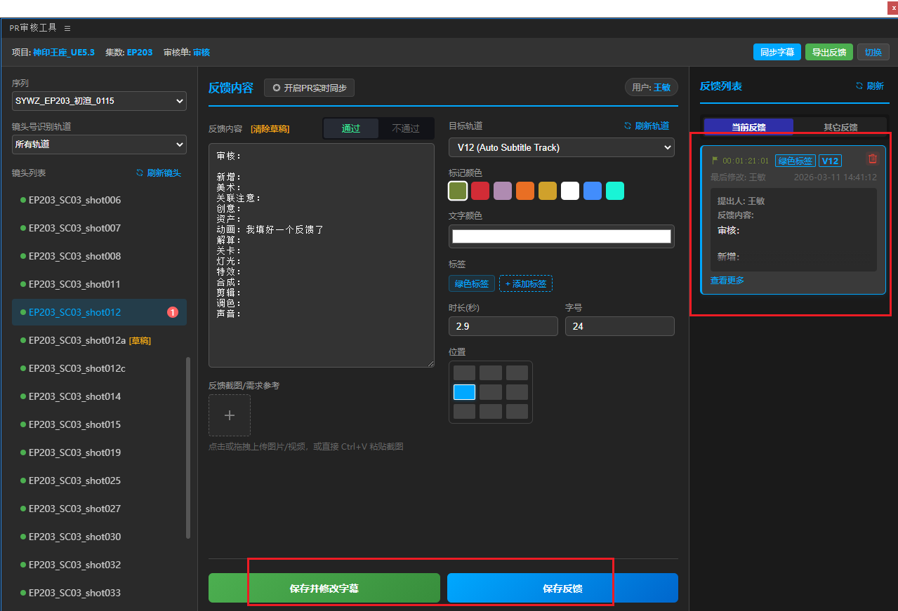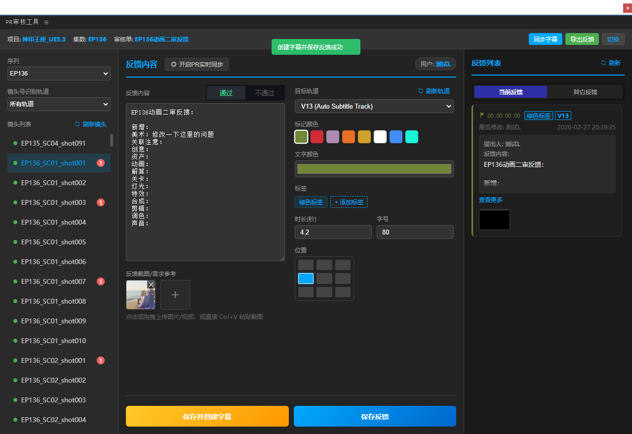 5、填好反馈内容表单,点击保存反馈(仅保存到Teamones,不会在PR工程中创建字幕),或是保存并创建字幕(保存到Teamones同时创建字幕),或是直接切换下一个镜头会将反馈自动存草稿(草稿不能一键保存,保存时任然需要切换到对应镜头去保存)