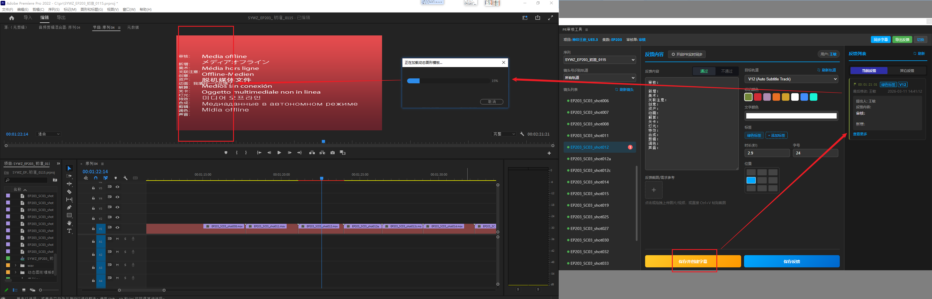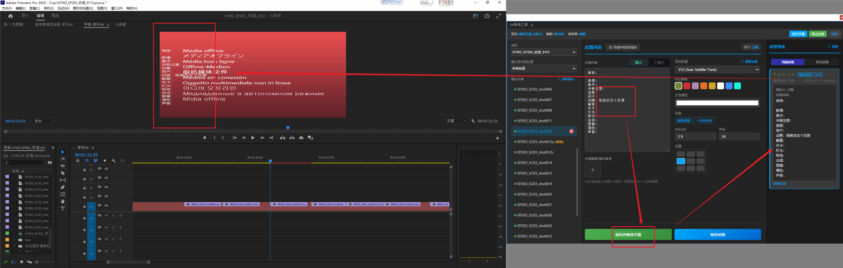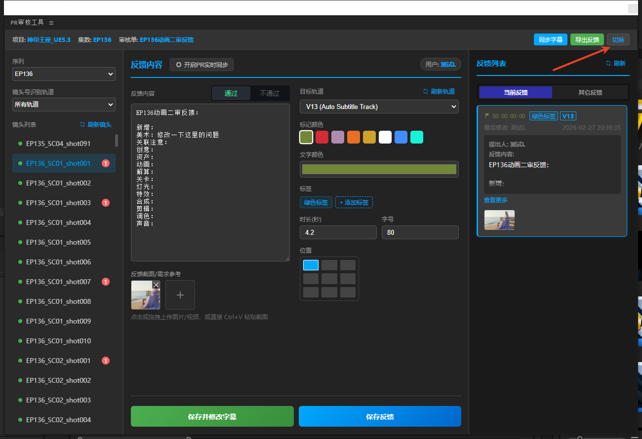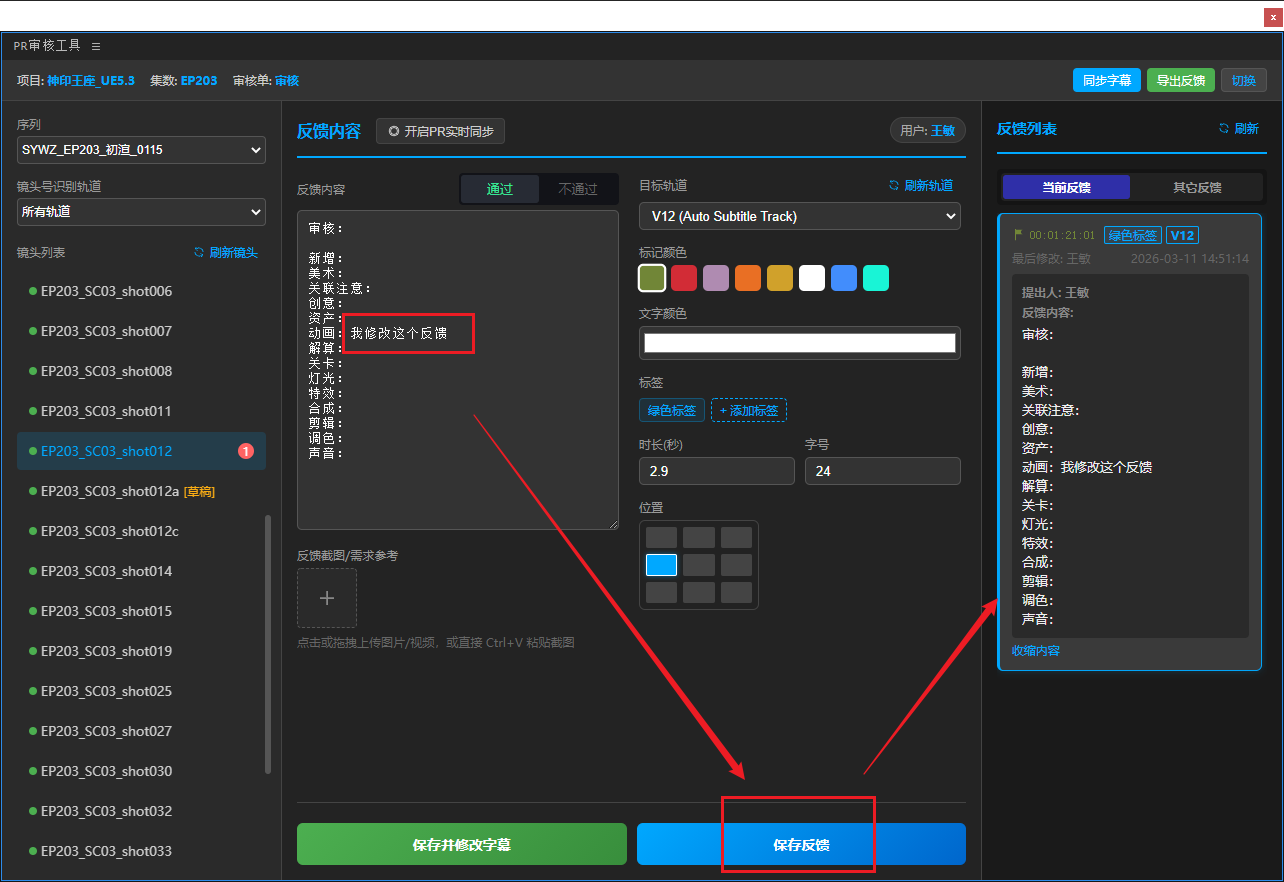 5、填好反馈内容表单,点击保存反馈(仅保存到Teamones,不会在PR工程中创建字幕),或是保存并创建字幕(保存到Teamones同时创建字幕),或是直接切换下一个镜头会将反馈自动存草稿(草稿不能一键保存,保存时任然需要切换到对应镜头去保存)