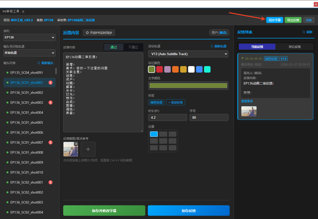 8、同步字幕:如果当前审核单中存在很多未创建字幕的反馈,可以点击这个按钮将所有反馈内容在指定轨道的对应镜头位置创建字幕