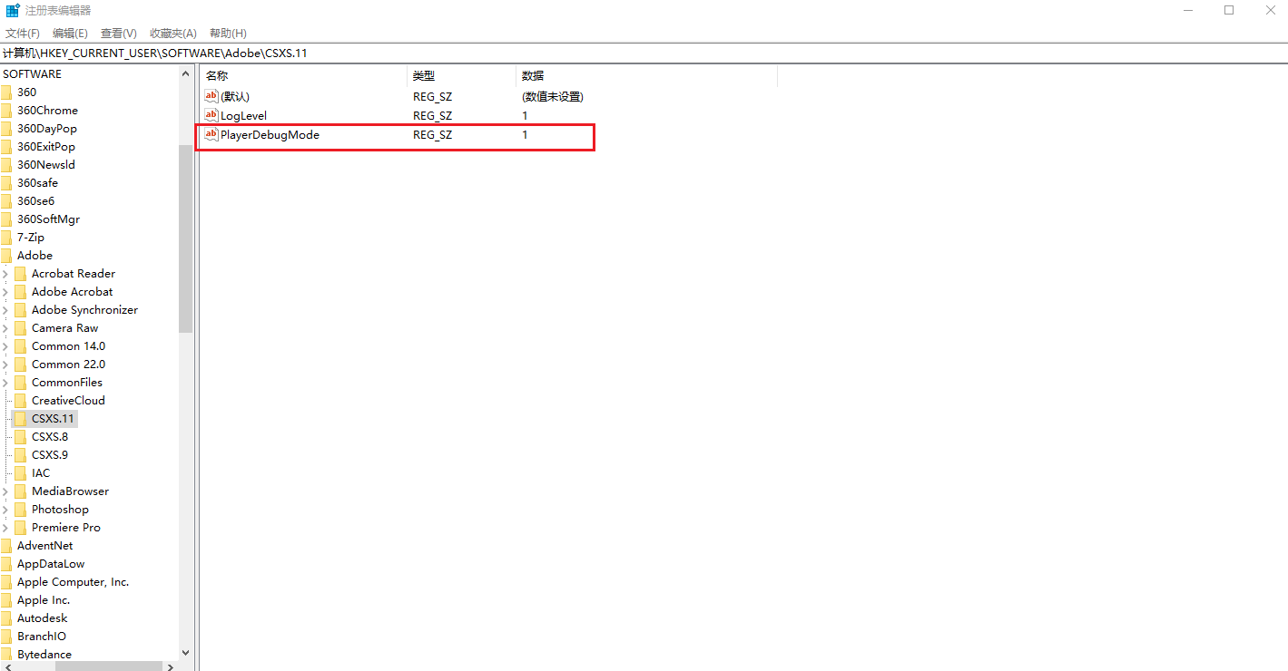 1、win+r打开注册表编辑器,检查是否存在“PlayerDebugMode”数值为“1”,若没有手动建立即可