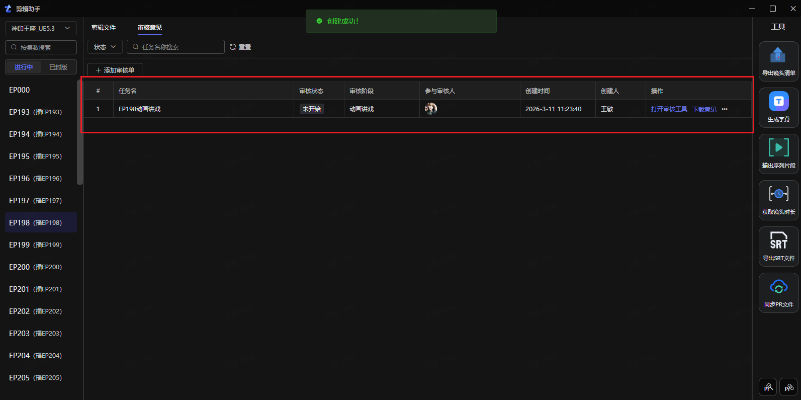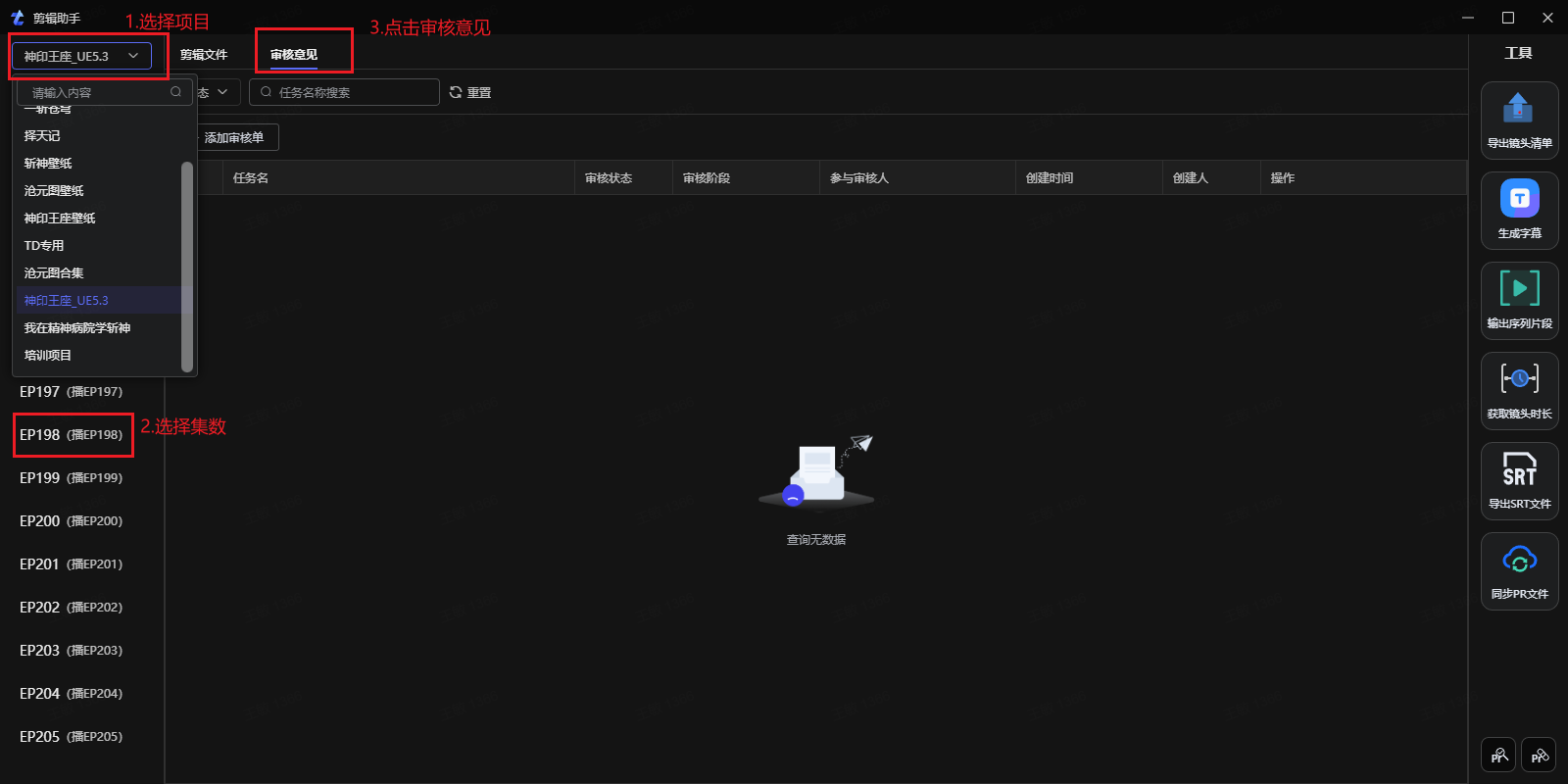 1、在剪辑助手中选择项目和集数,再点击审核意见进入审核意见功能