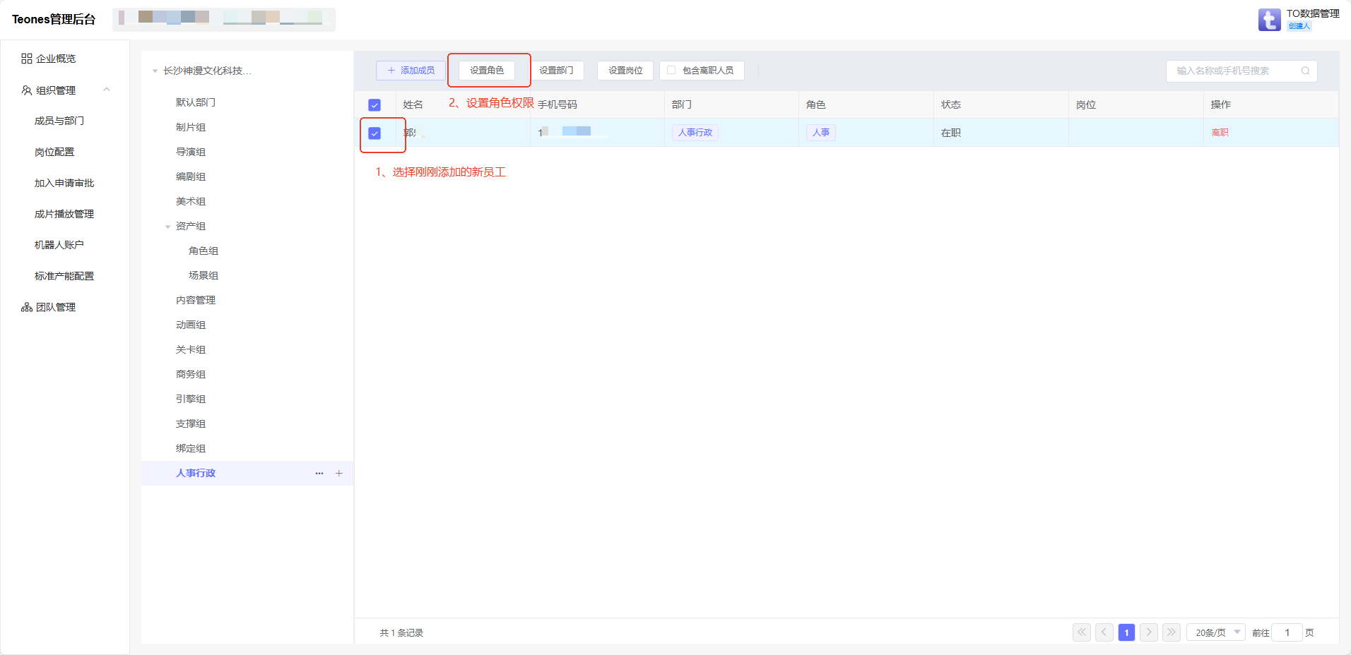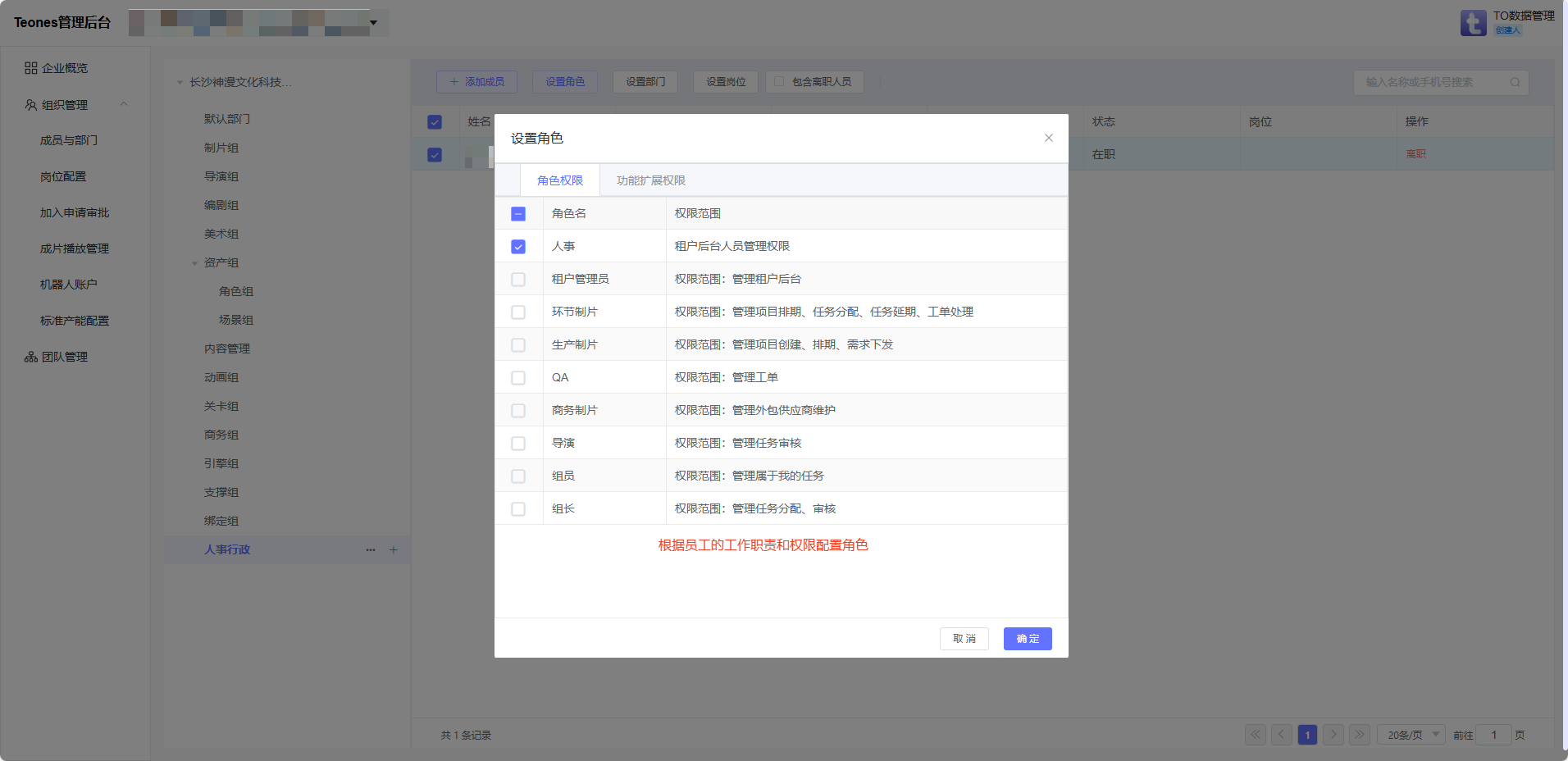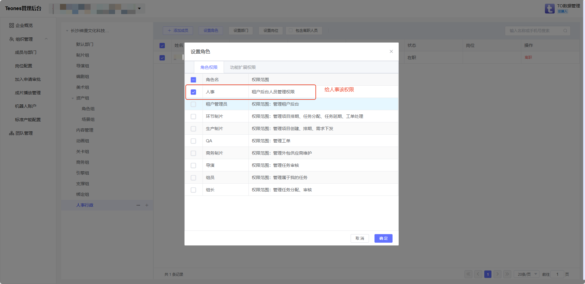 给人事同事如下图角色权限,仅可以进入后台管理公司人员和组织结构。
