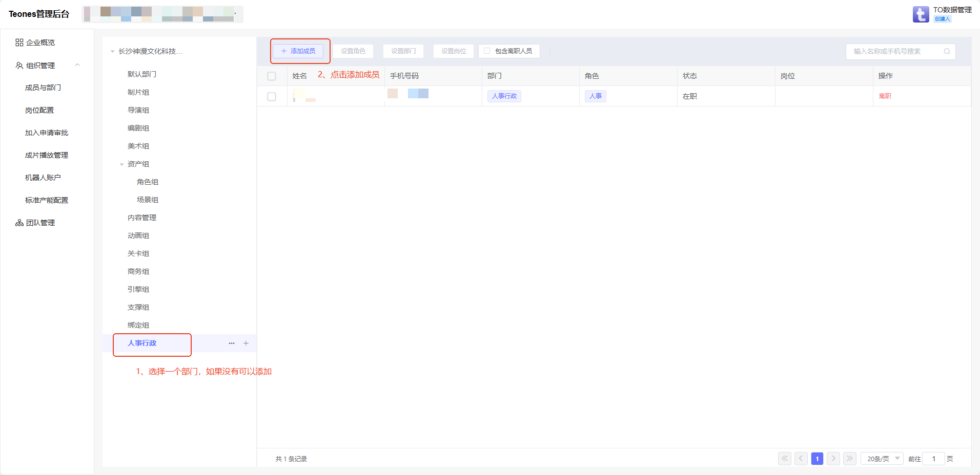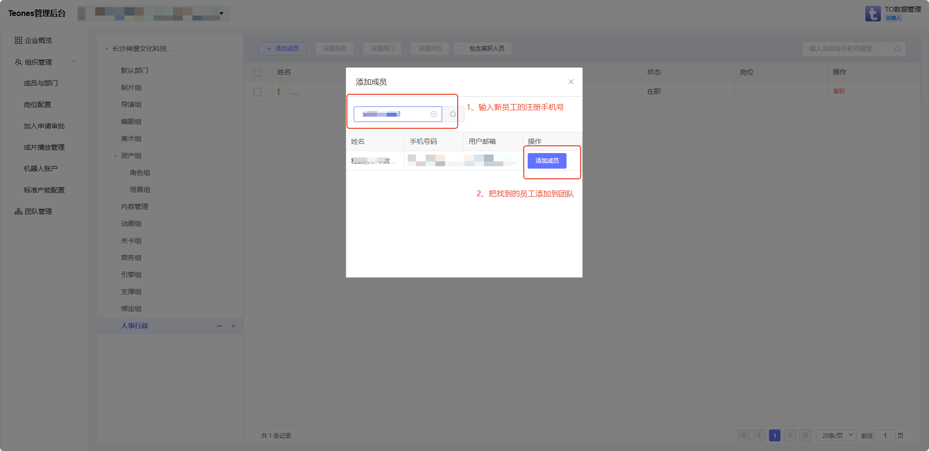 | 1. 入职人员添加 | 把新加入公司的人员添加到TEONES团队或者审批加入团队申请 |