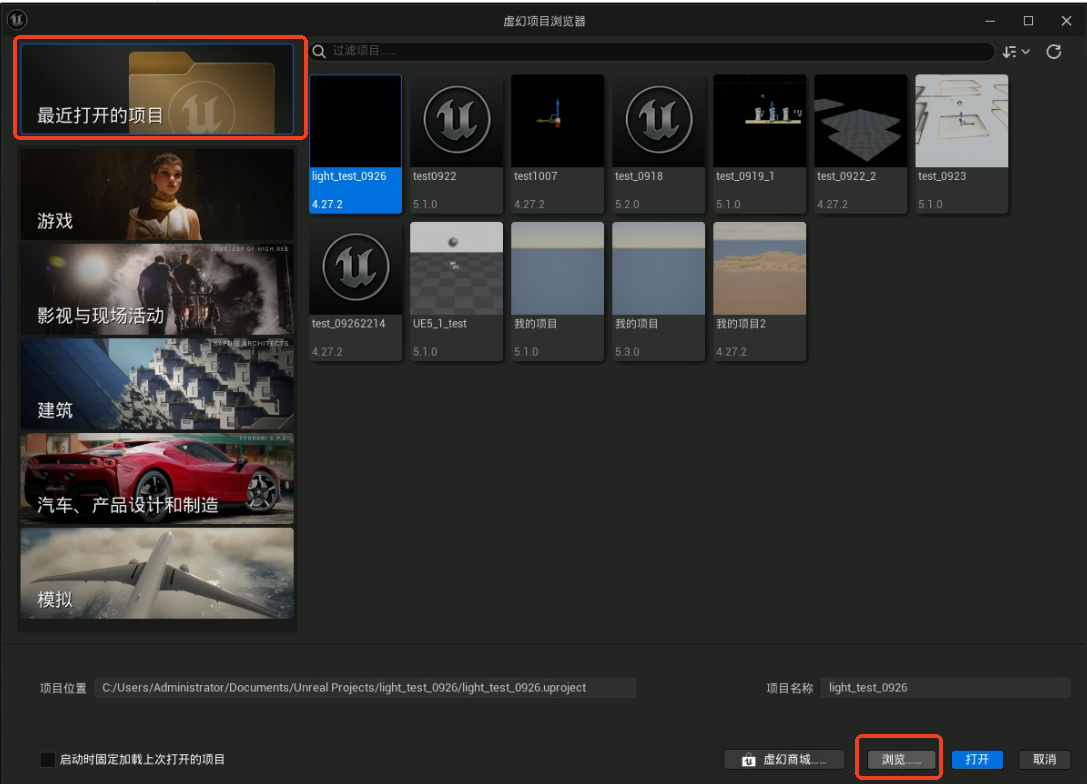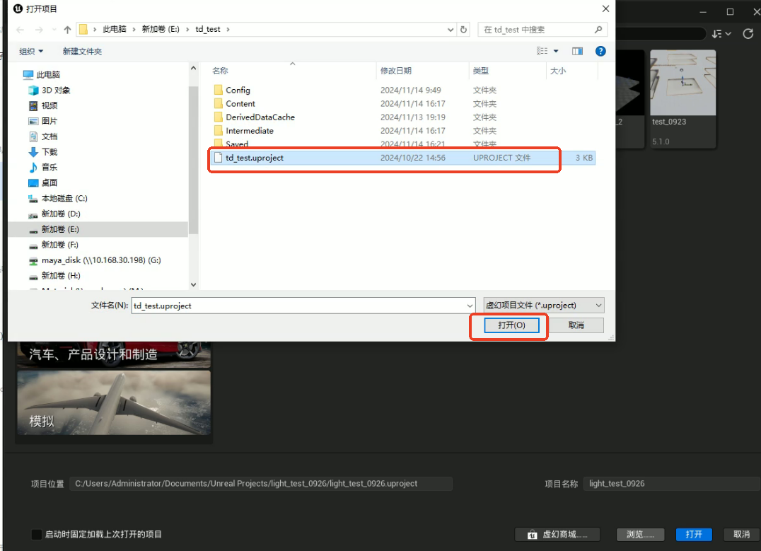选择所需制作的项目的“.uproject”文件,然后点击打开