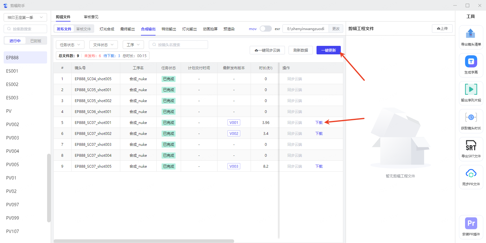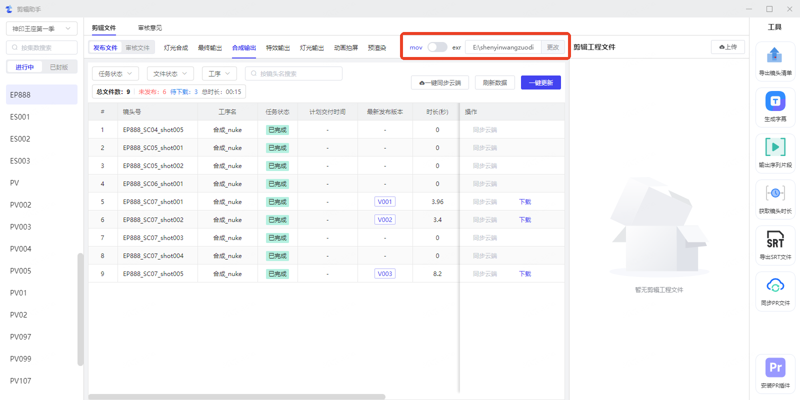 - 一键更新:更新所有待下载镜头EXR序列至目标目录;