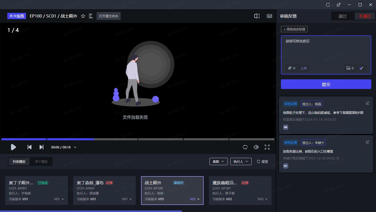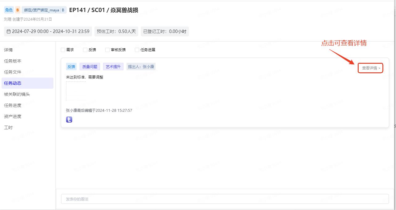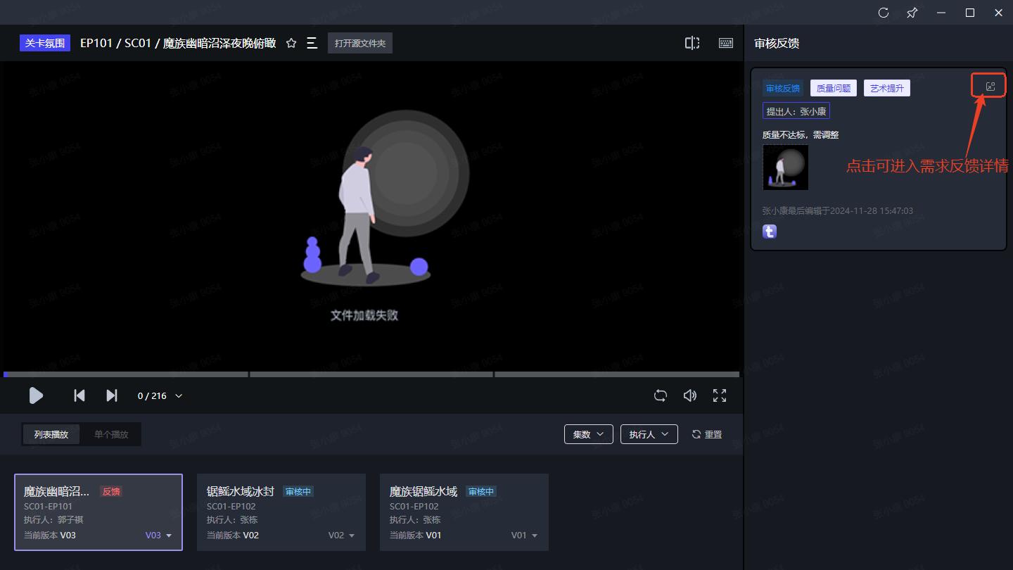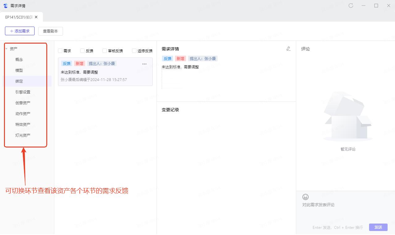需求详情页可查看资产、关卡、镜头各个环节的需求反馈