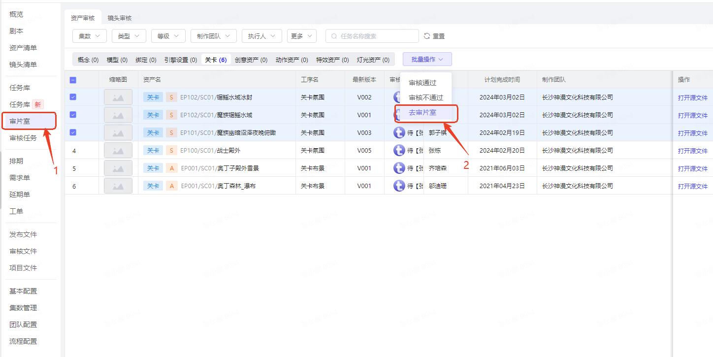 选择项目 -> 审片室 -> 批量操作 -> 去审片室