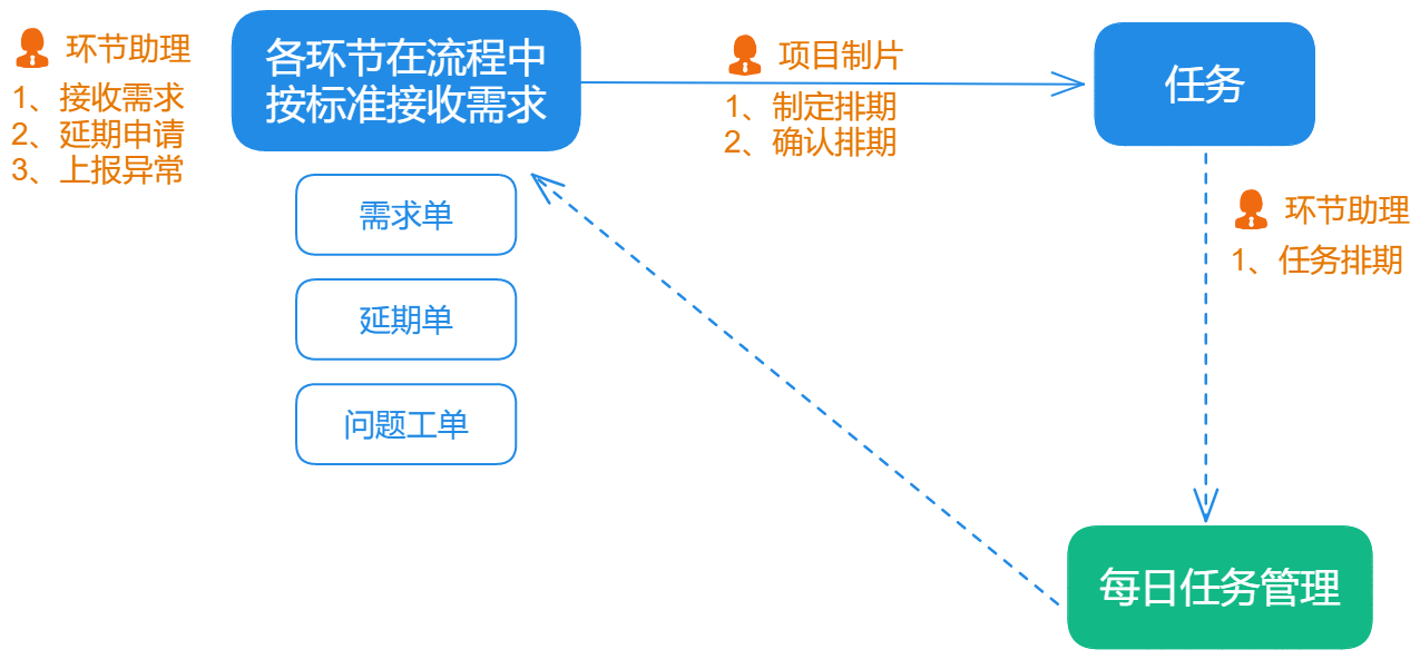 | 3. 项目生成制片审批 | 环节上下游确认完毕后由项目制片最终审批 |
