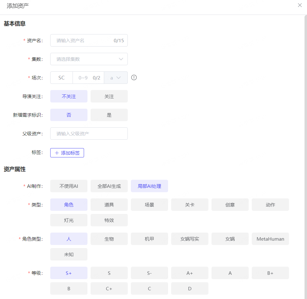 入口:资产清单 -> 添加资产 -> AI制作:选择局部AI处理、全部AI生成