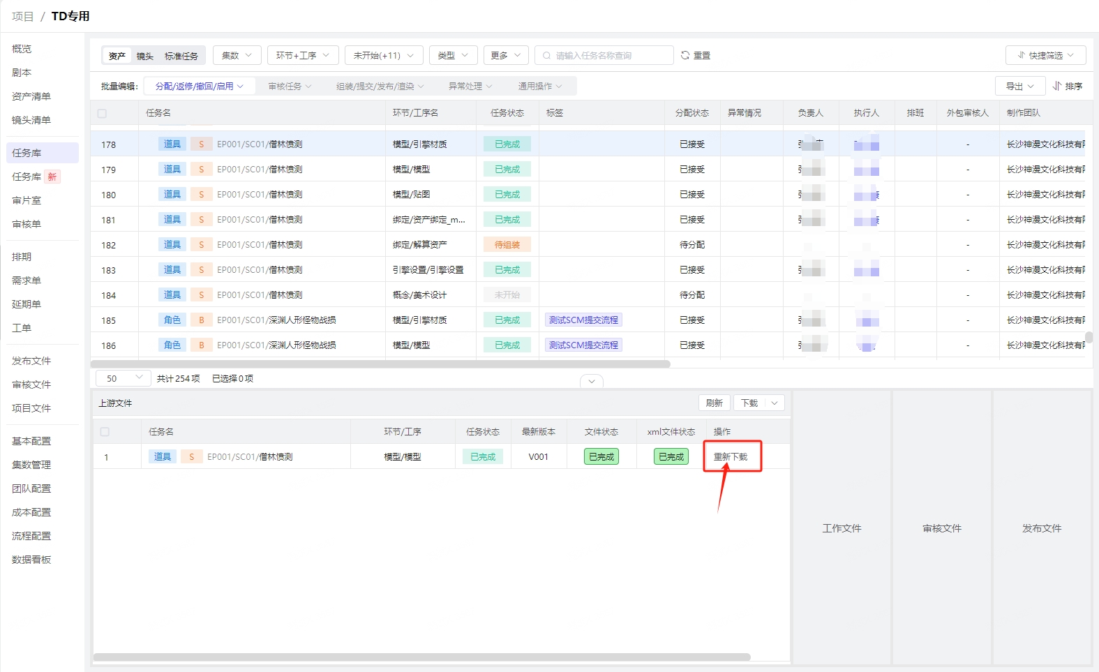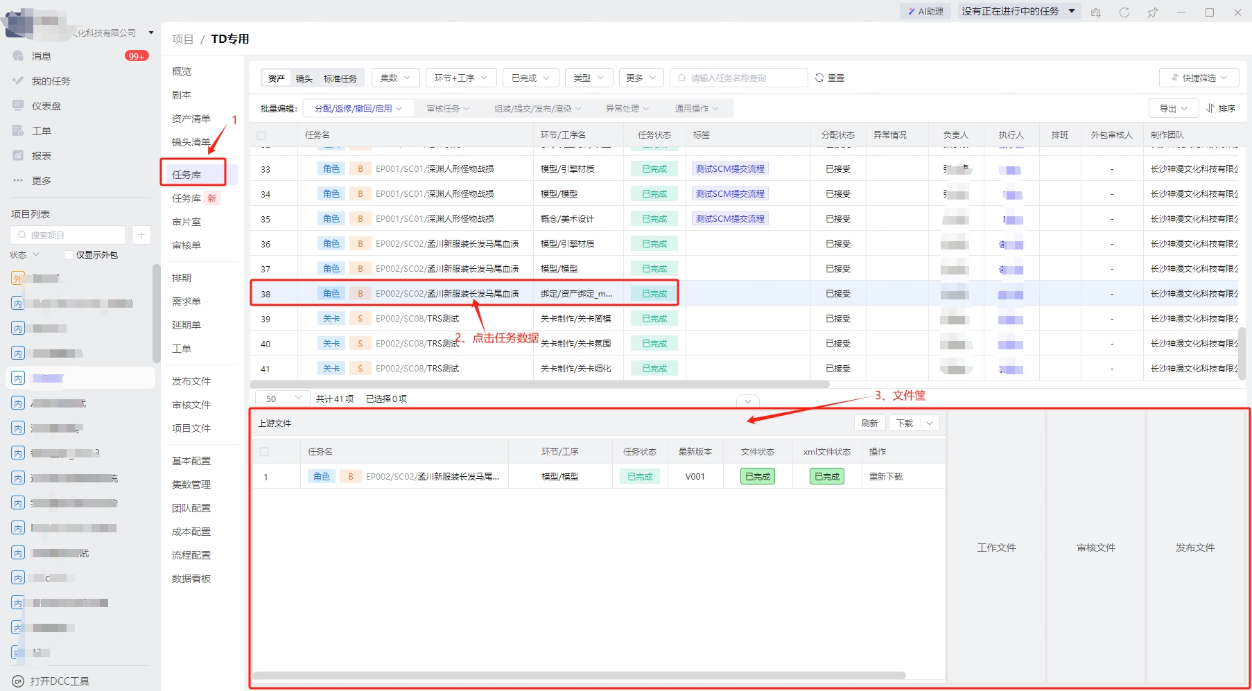 进入项目,在左侧的导航栏中点击任务库,进入任务库后选中需要操作的任务,任务列表下方会弹出文件筐,如下图: