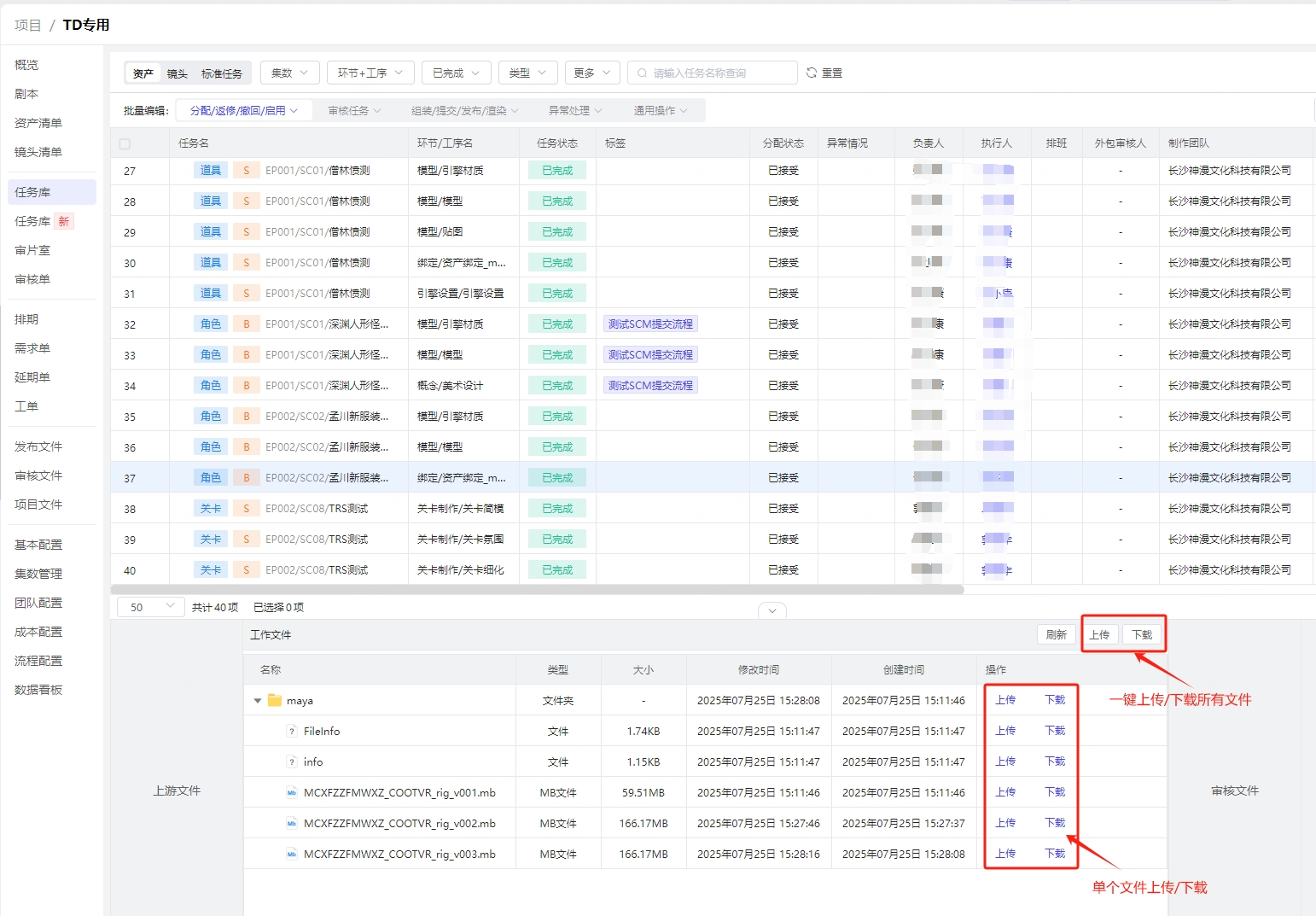 - 1、单个文件上传/下载,在工作文件列表右侧的操作列点击