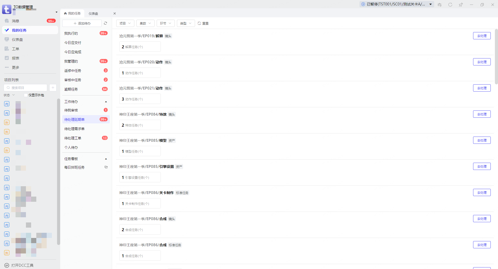 我执行的、今日应交付、今日应完成、我管理的、返修中任务、审核中任务和逾期任务,这些页面操作与任务库操作一致。