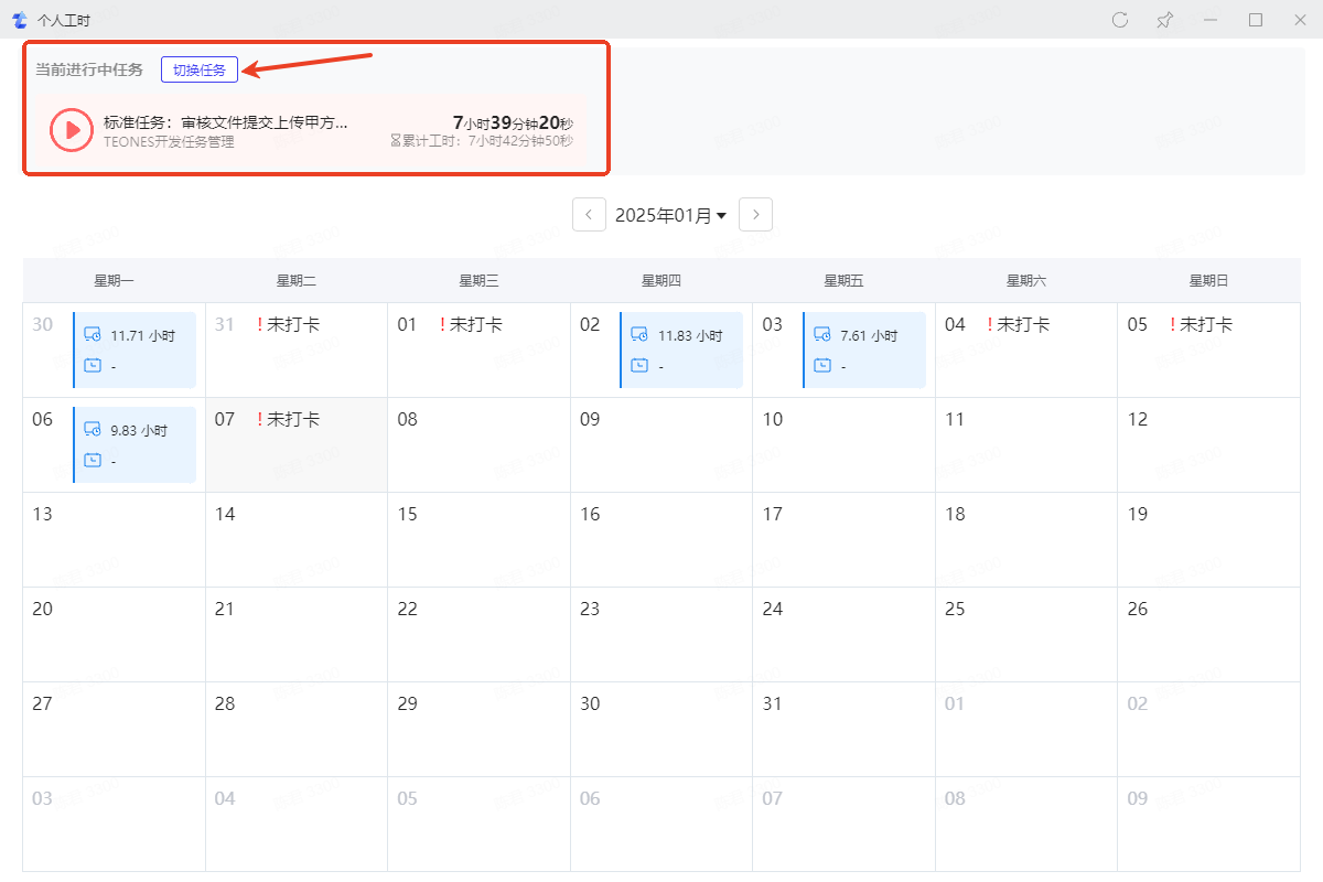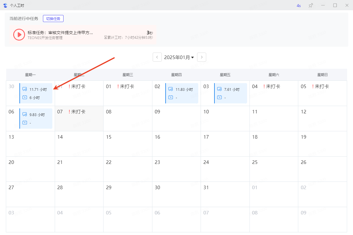 点击日历中未打卡记录,当天之前的日期会先自动同步钉钉打卡记录,当天可以手动同步钉钉打卡记录,同时暂停当前进行中任务