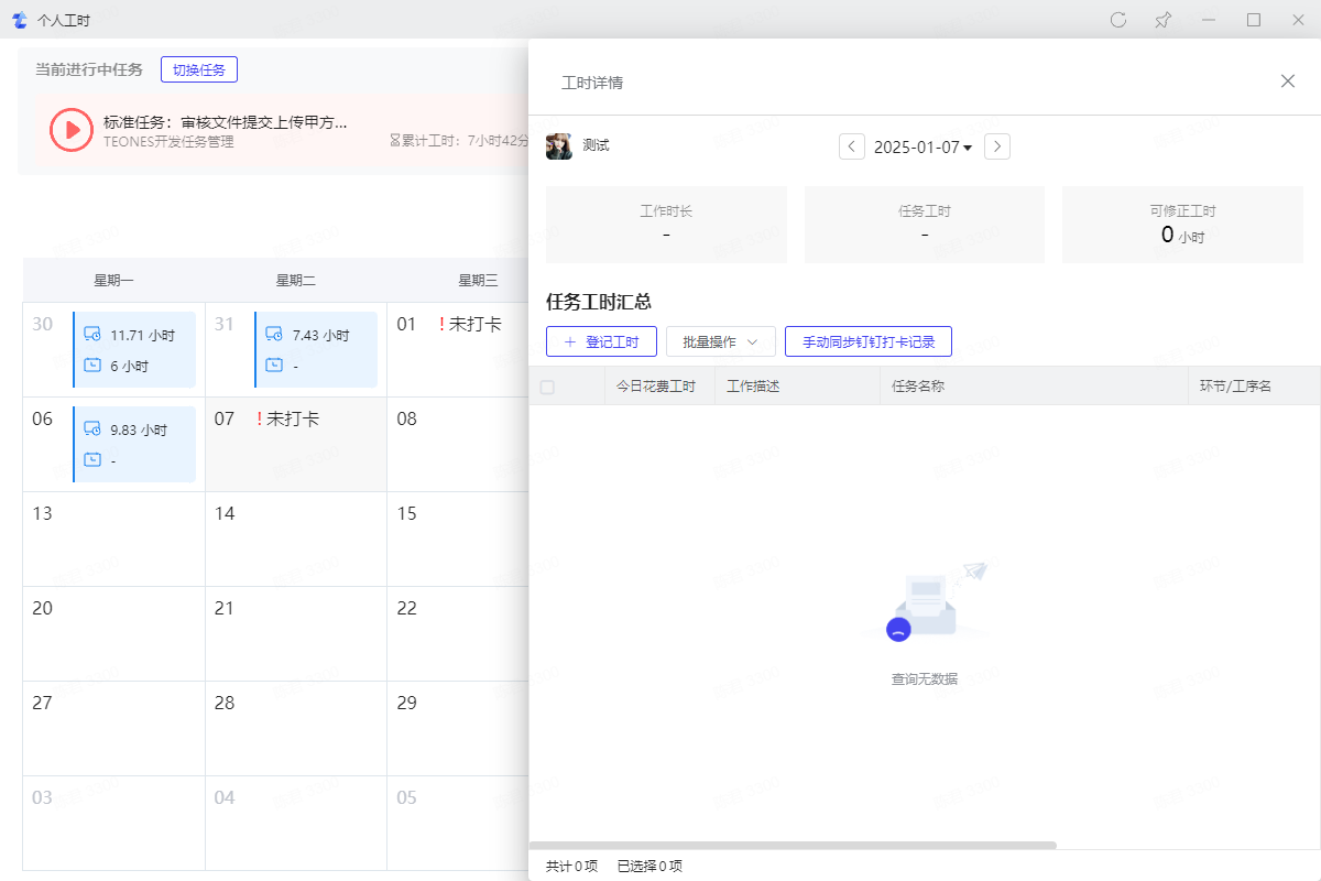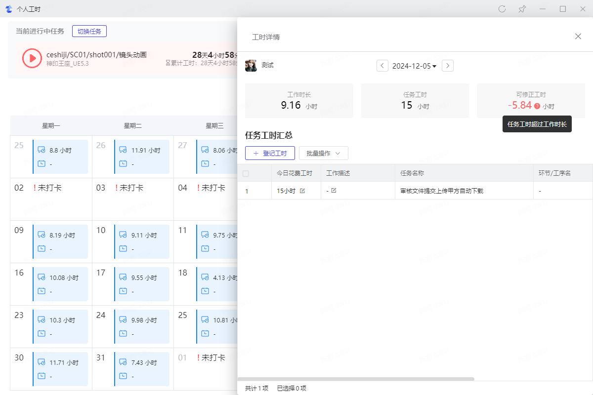 3.5、任务登记工时超出打卡时长会显示可修正工时为负数,调小任务工时直到可修正工时为零即可