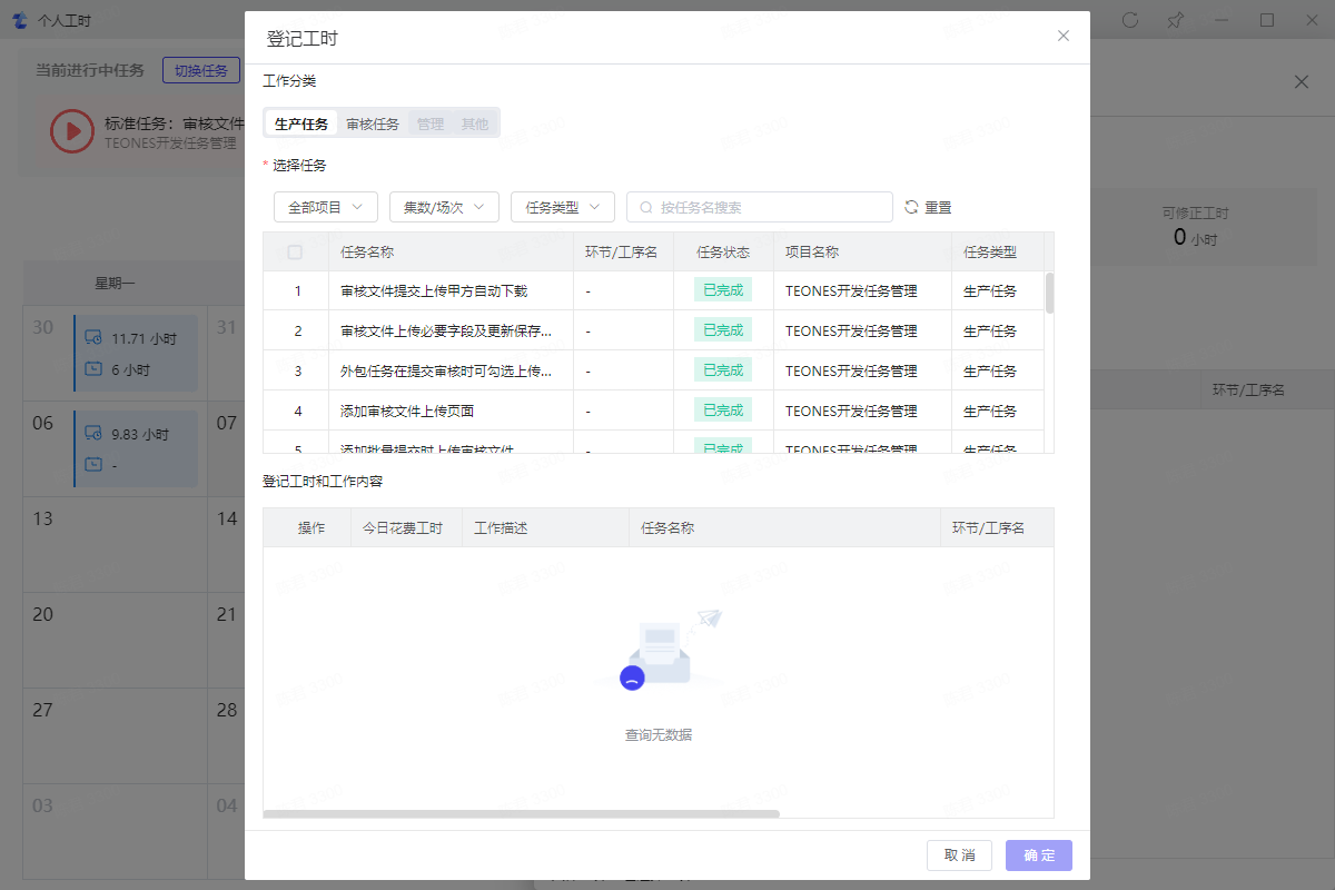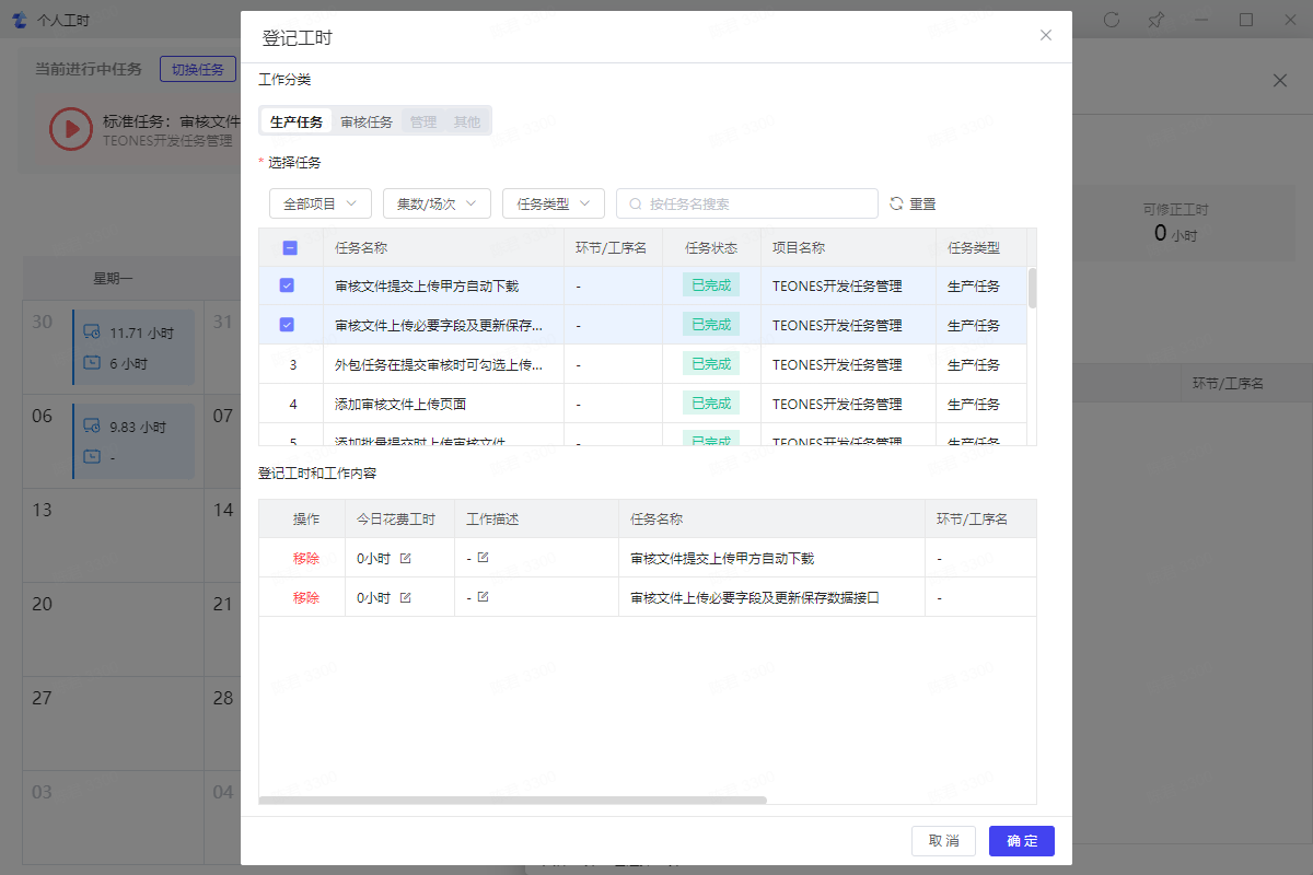 3.4、勾选要登记工时的任务,填写今日花费工时和工作描述后确定即可将任务工时登记到当天
