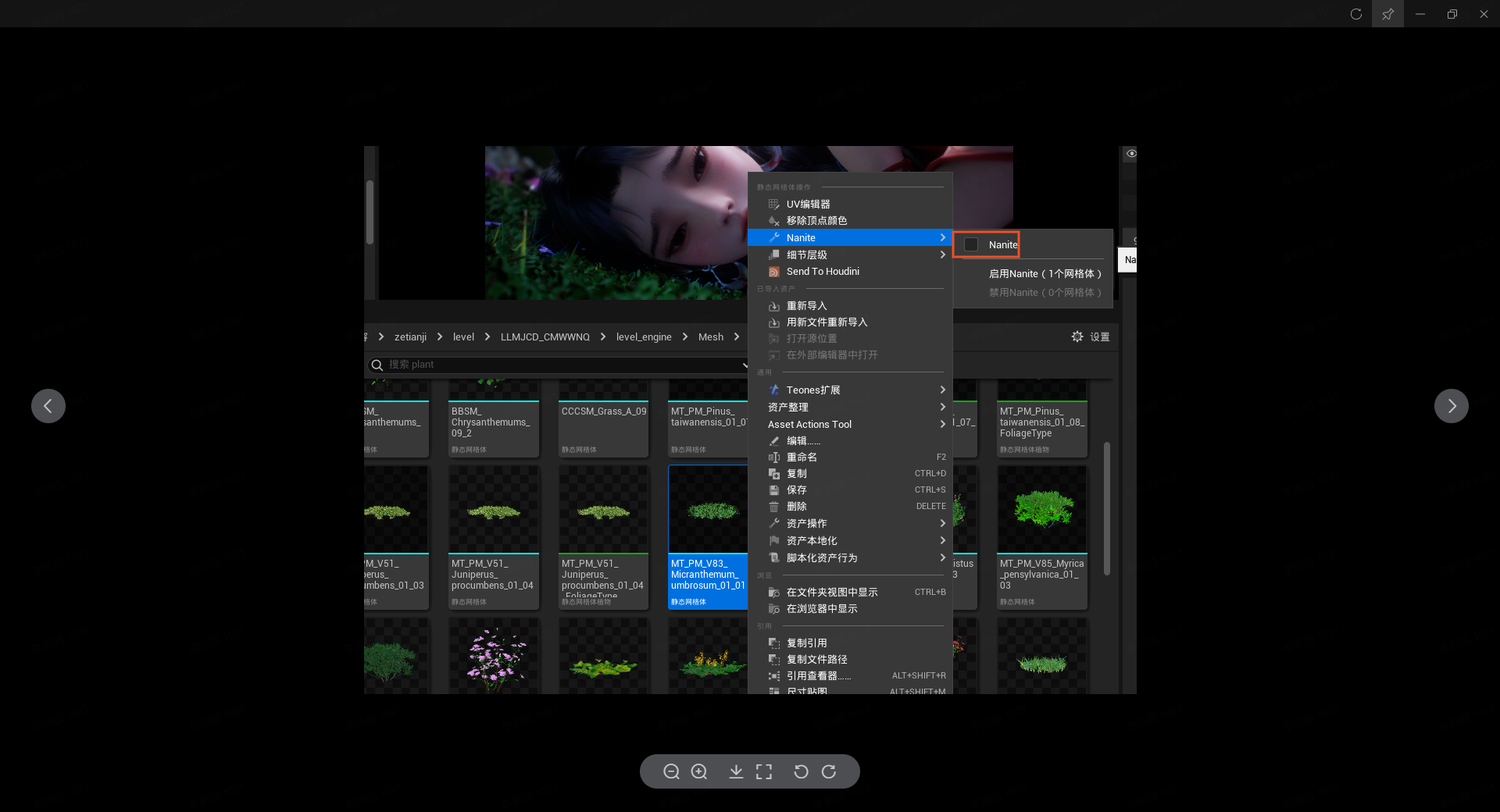 草地模型开启了Nanite ,Nanite 是 UE5 中一项先进的虚拟微多边形几何体技术。它允许开发者导入具有海量多边形的高细节模型,引擎会自动对这些模型进行智能处理,根据相机的距离和视角动态地对几何体进行细分和优化