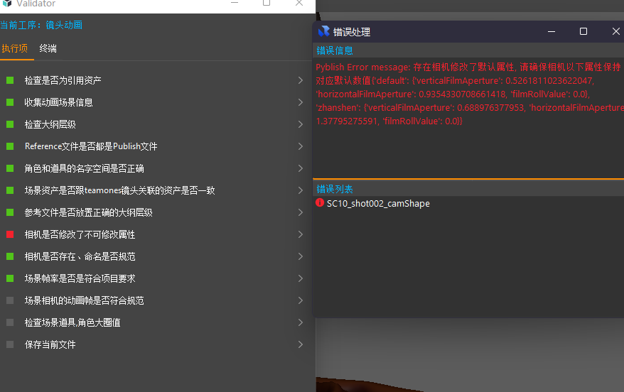 Pyblish Error message:存在相机修改了默认属性, 请确保相机以下属性保持对应默认数值:CAMERA_SETTING .....................