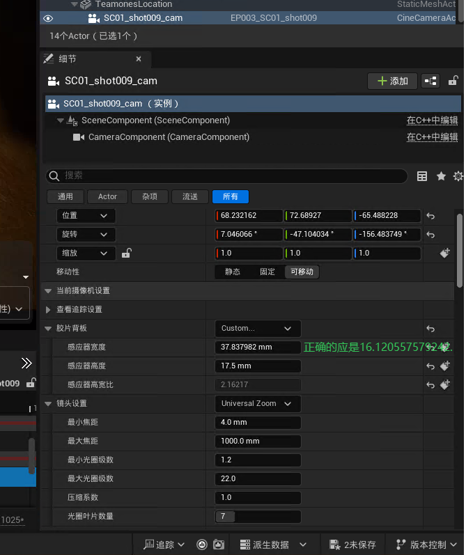 动画的相机光圈值有问题,引擎中的光圈值是根据动画光圈值算出来的,例如zhetianji:0.63466762123*25.4=16.120557579242 zetianji的除了EP001', 'EP002', 'PV001'其他的光圈值是: 1.48968439213 0.63466762123