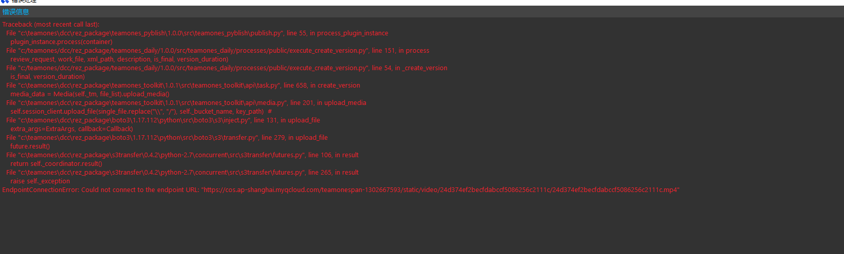 EndpointConnectionError: Could not connect to the endpoint URL: "cos.ap-shanghai.myqcloud.com/xxxxx/static/video/24d374ef2becfdabccf5086256c2111c/24d374ef2becfdabccf5086256c2111c.mp4"