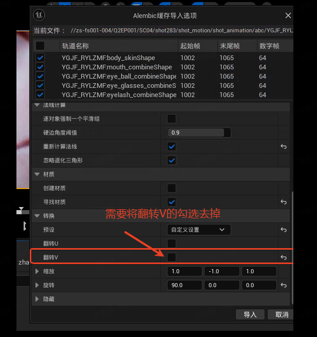 1、解算翻转布料v通道重新输出 2、解算检查文件是无问题的,制作人若是手动导的则需要导入的时候将翻转V的勾选去掉。 下面是导入设置截图