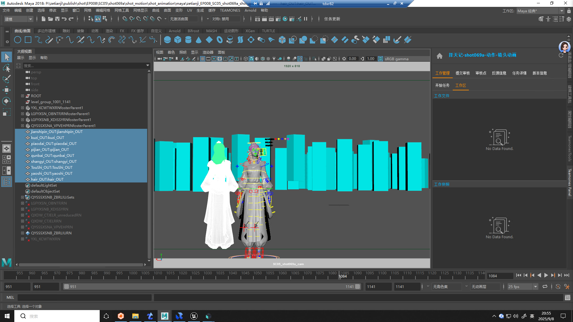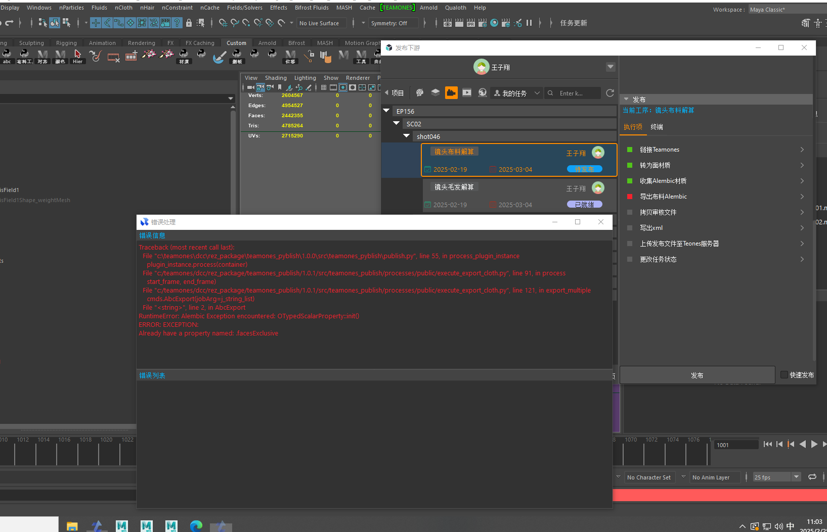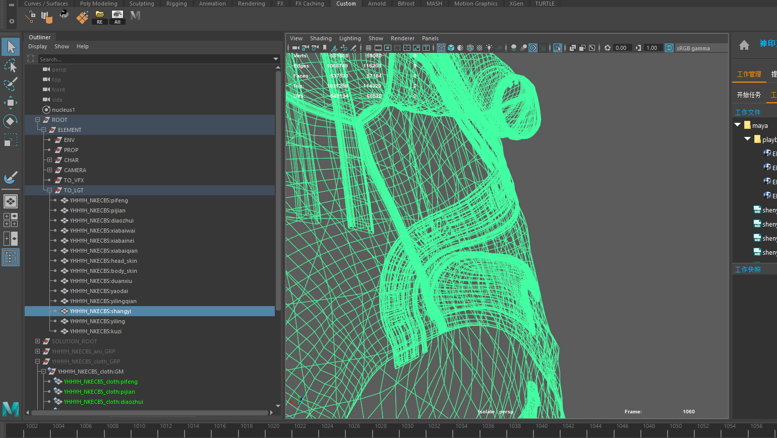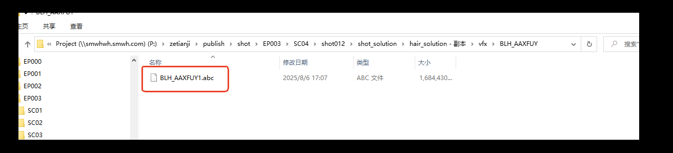 打开动画的maya文件,导入解算abc,检查是否对上 动画maya文件路径:P:\项目名\publish\shot\集\场次\镜头号\shot_motion\shot_animation\maya 解算布料abc路径:P:\项目名\publish\shot\集\场次\镜头号\shot_solution\cloth_solution\vfx 解算毛发abc路径:P:\项目名\publish\shot\集\场次\镜头号\shot_solution\hair_solution\vfx